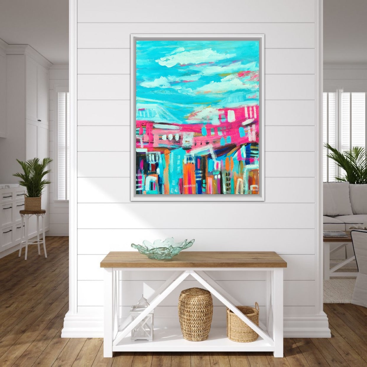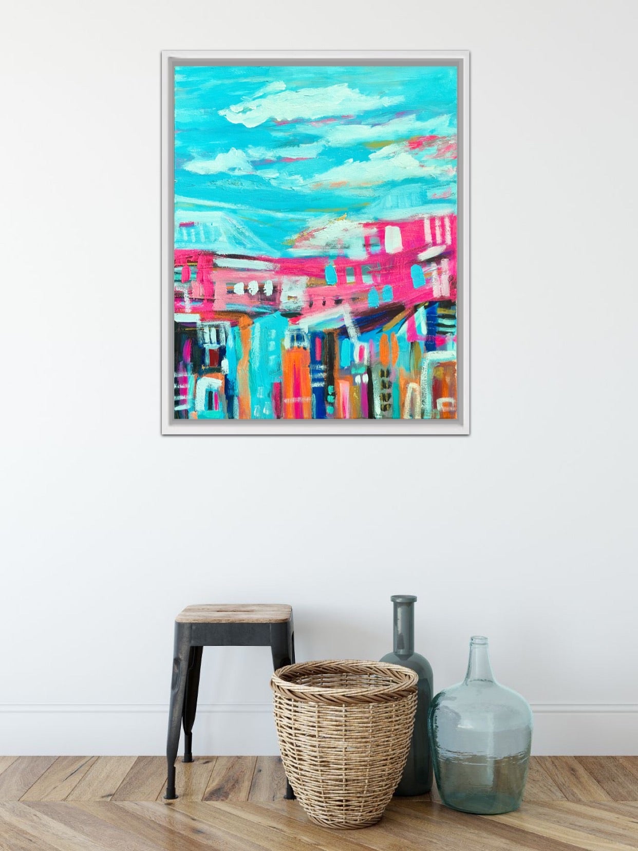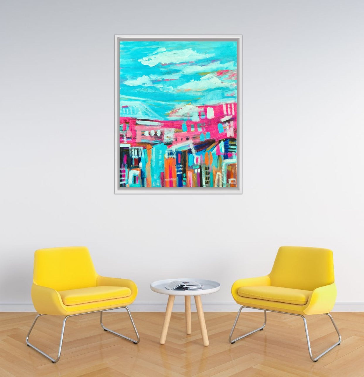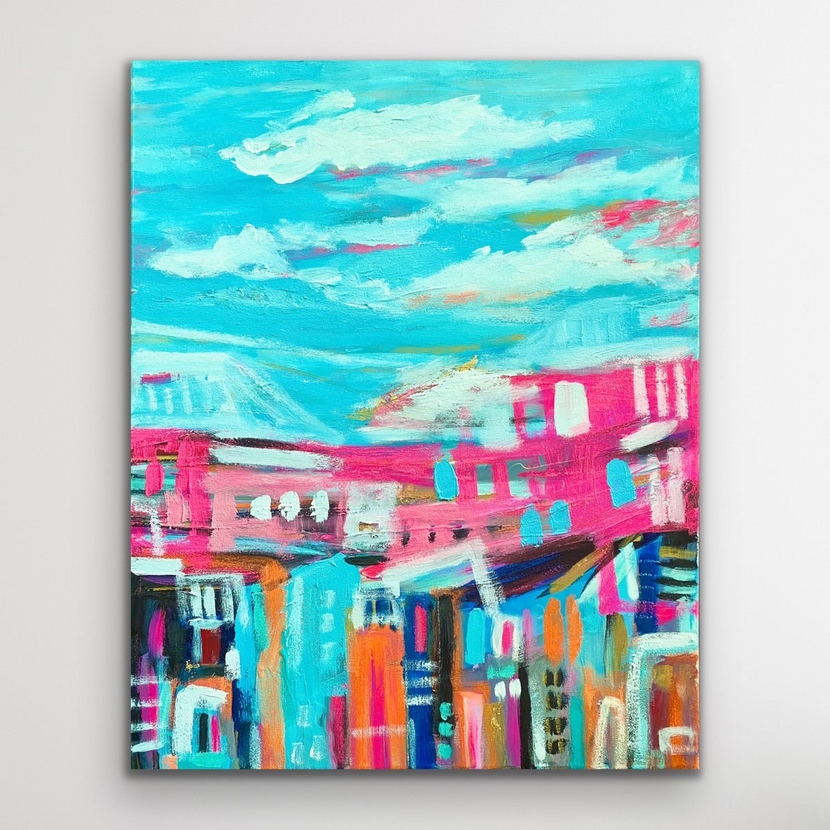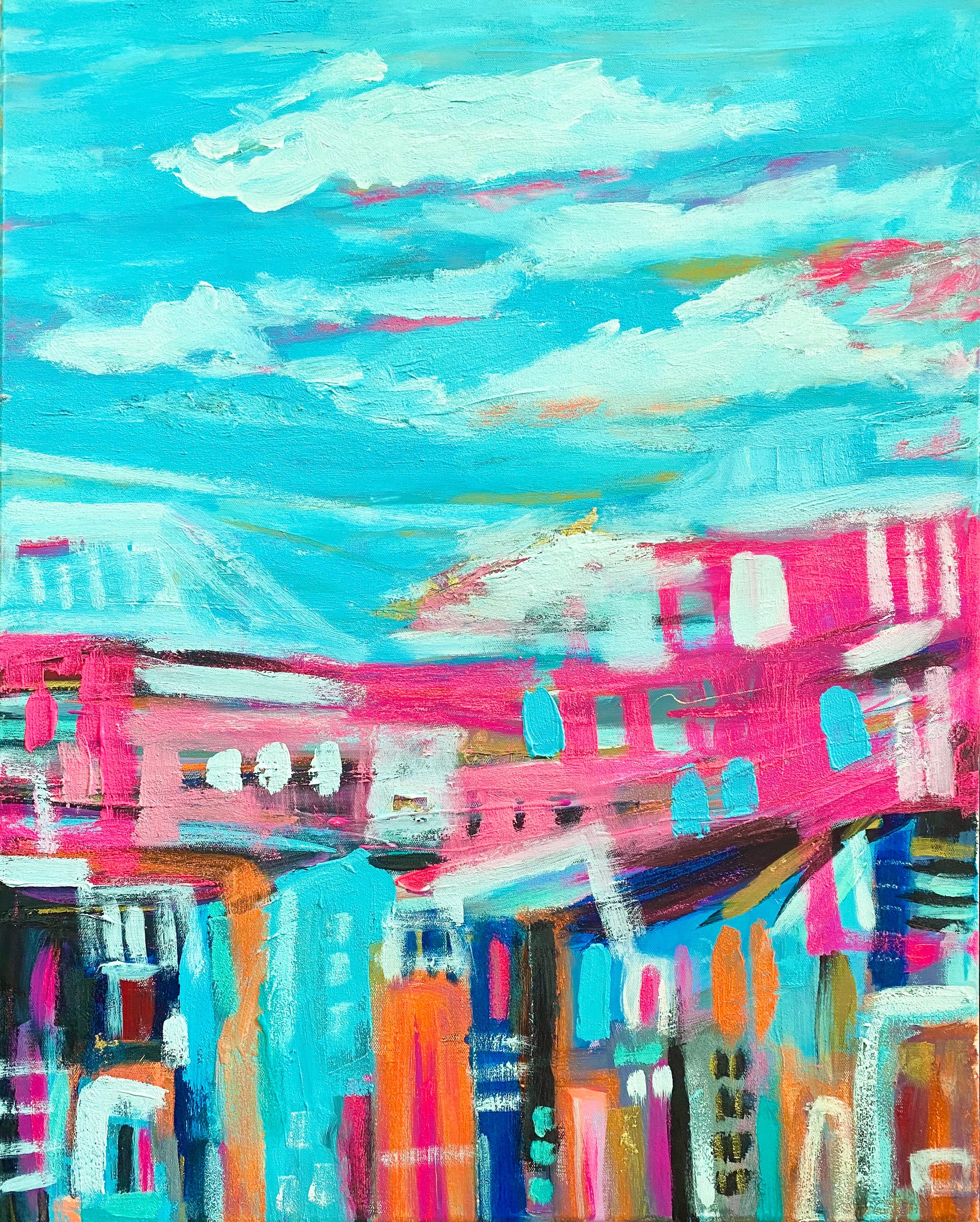 Blue Skies and Positive Vibes is an abstract landscape painted in positive colours this is a very unique piece.