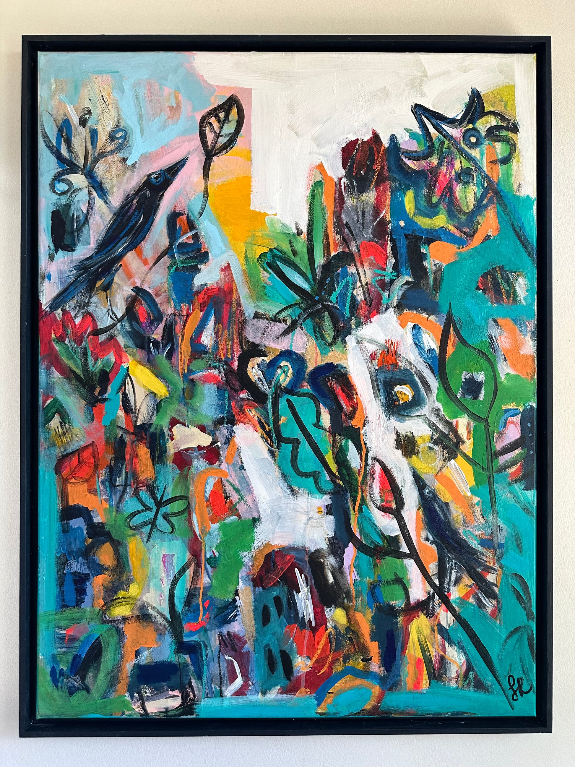 Discover the beauty of nature with our "Hide and Seek" painting. Admire the intricate details of tropical birds hidden within a botanical garden, brought to life through various layers and mixed media on canvas. Perfect for adding a touch of nature and art to any room.