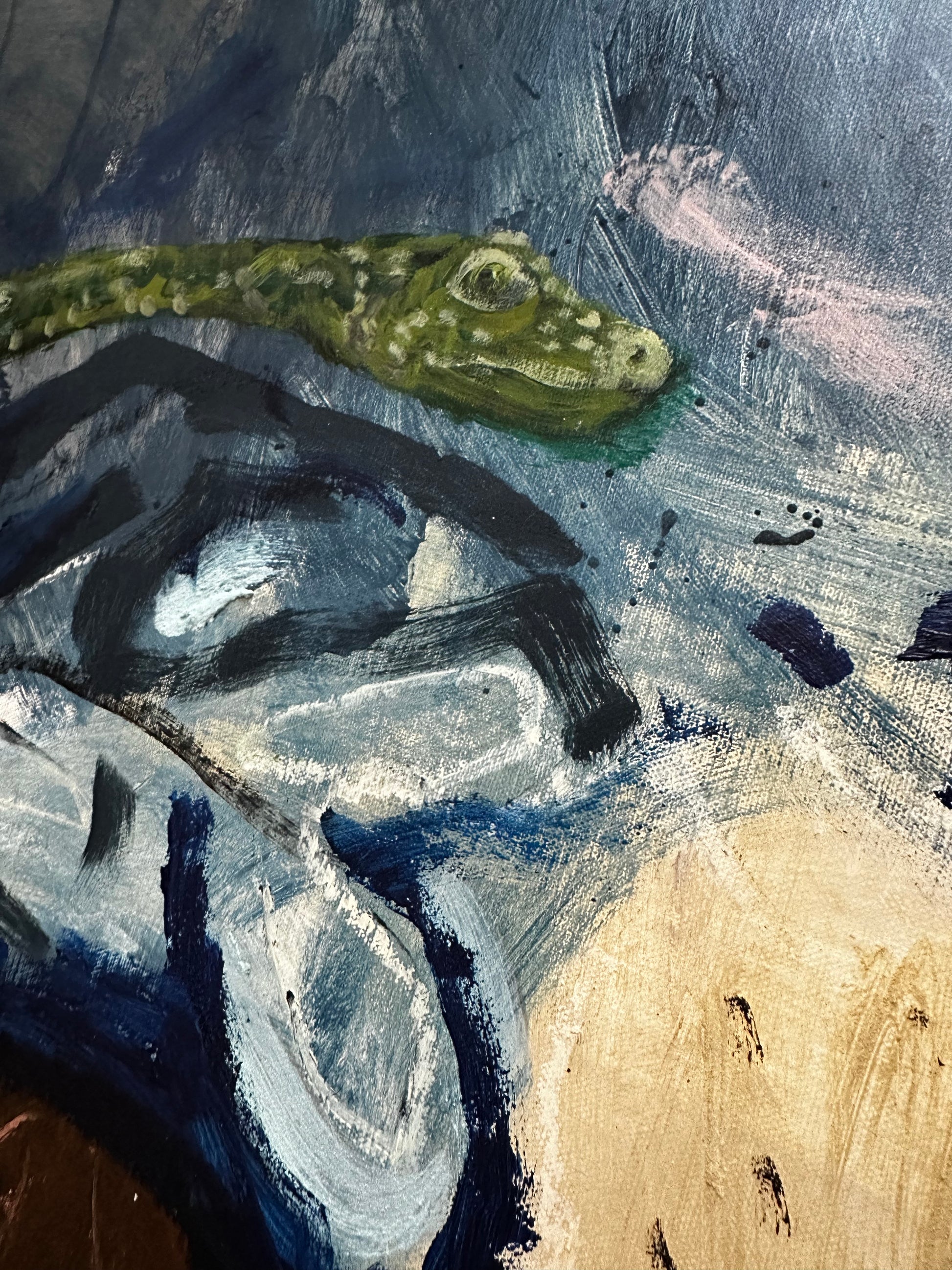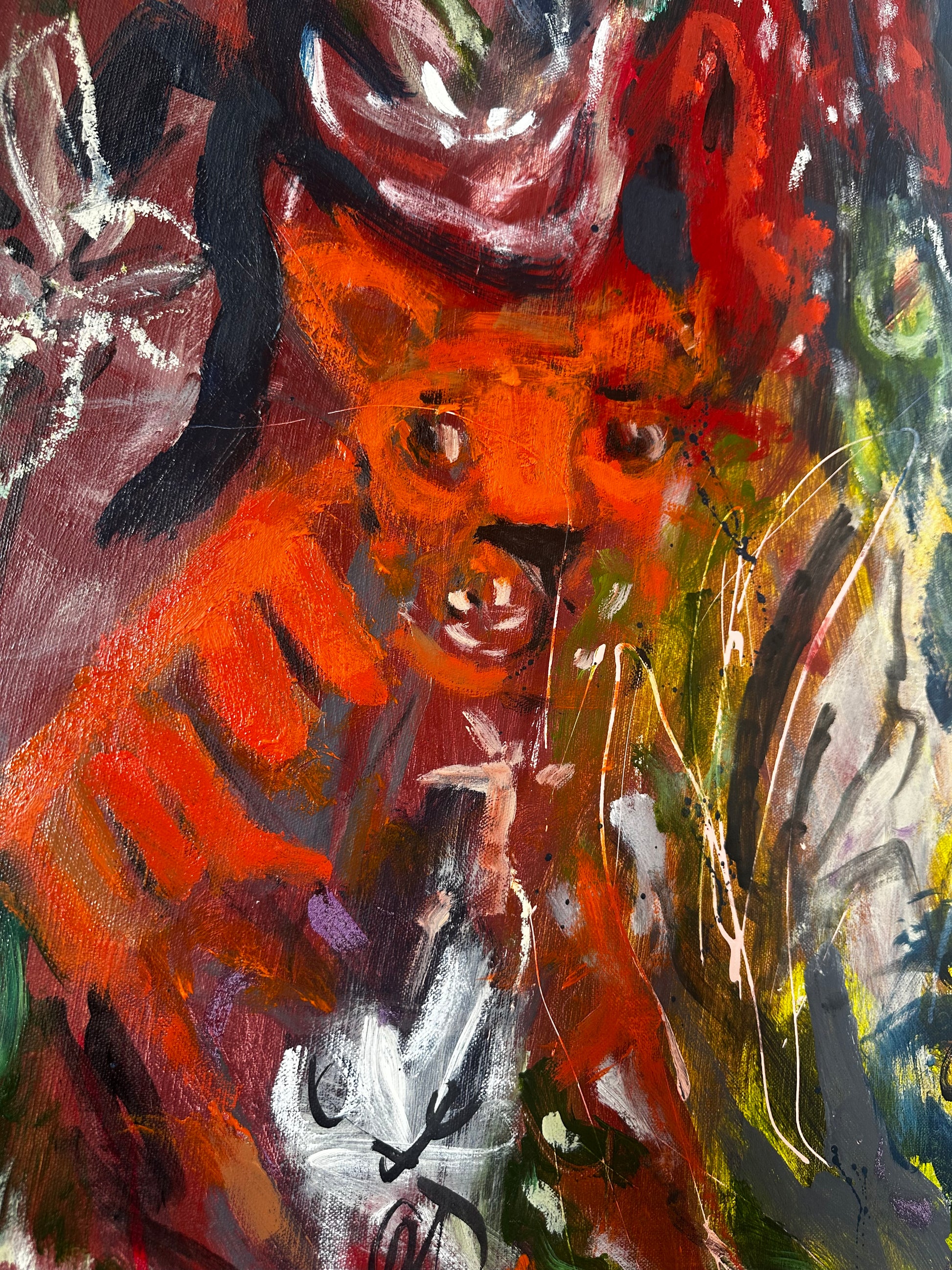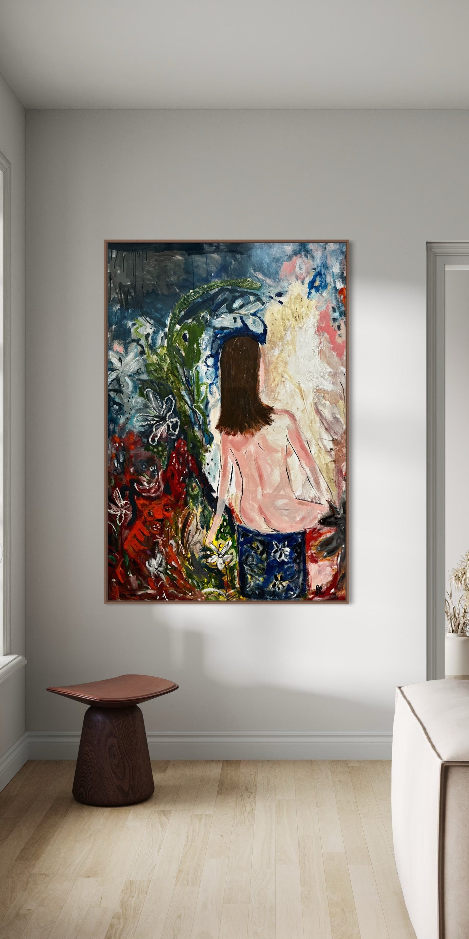 This acrylic, oil, oil stick and sand painting features a figure gazing into a bright light. Her companions are a Tiger, a dog and a snake. Creatures meant to offer protection, longevity and strength.