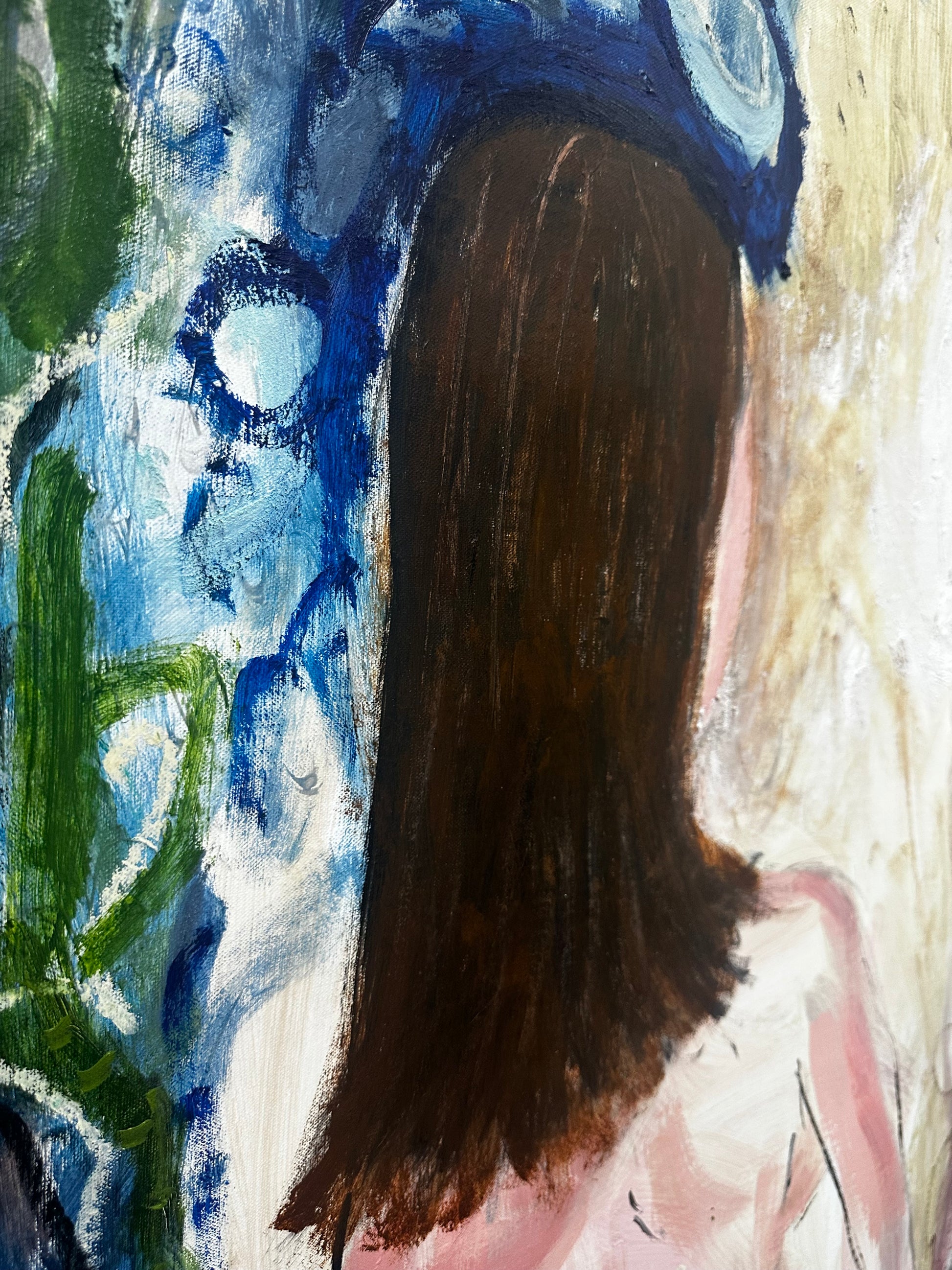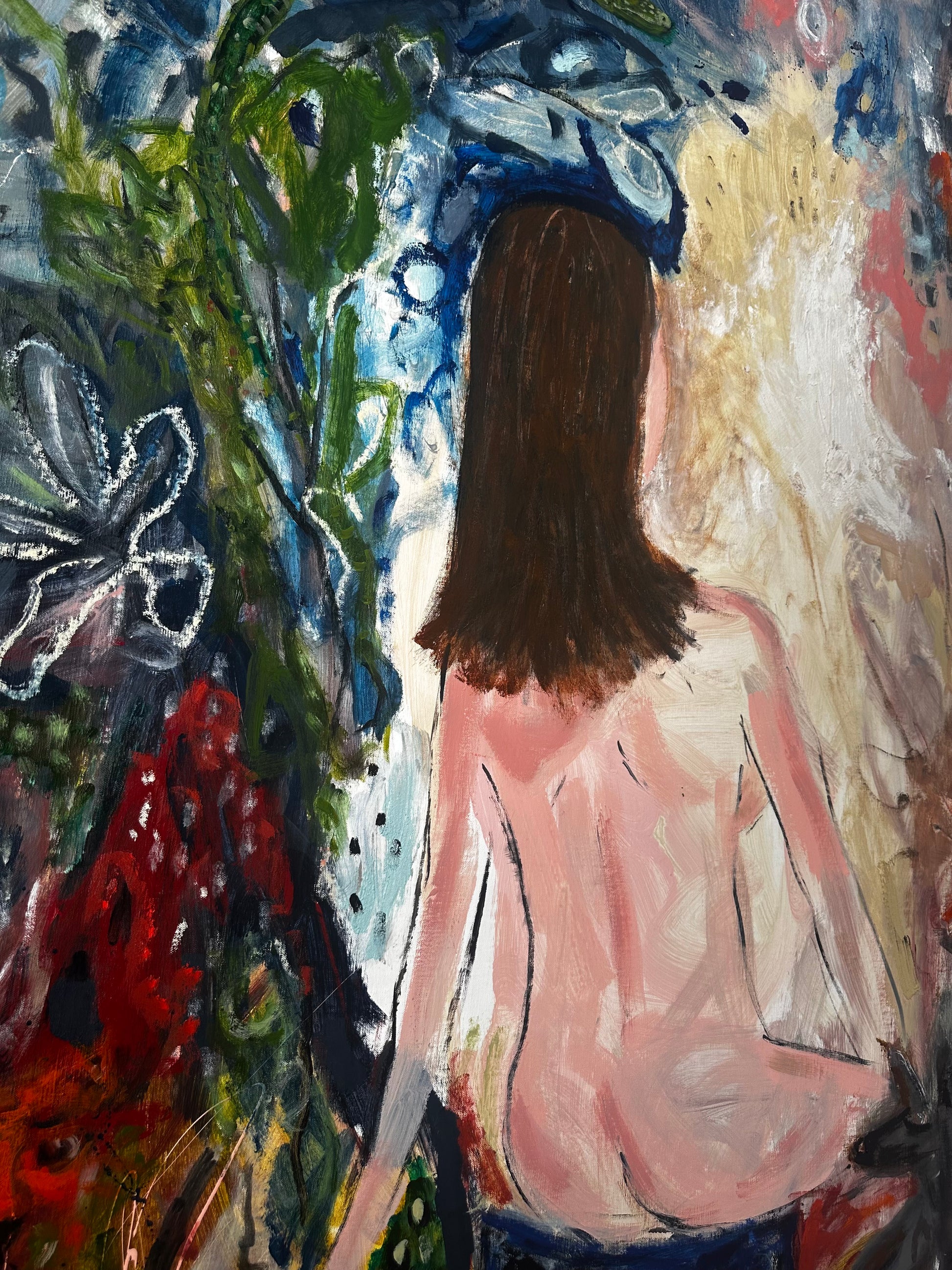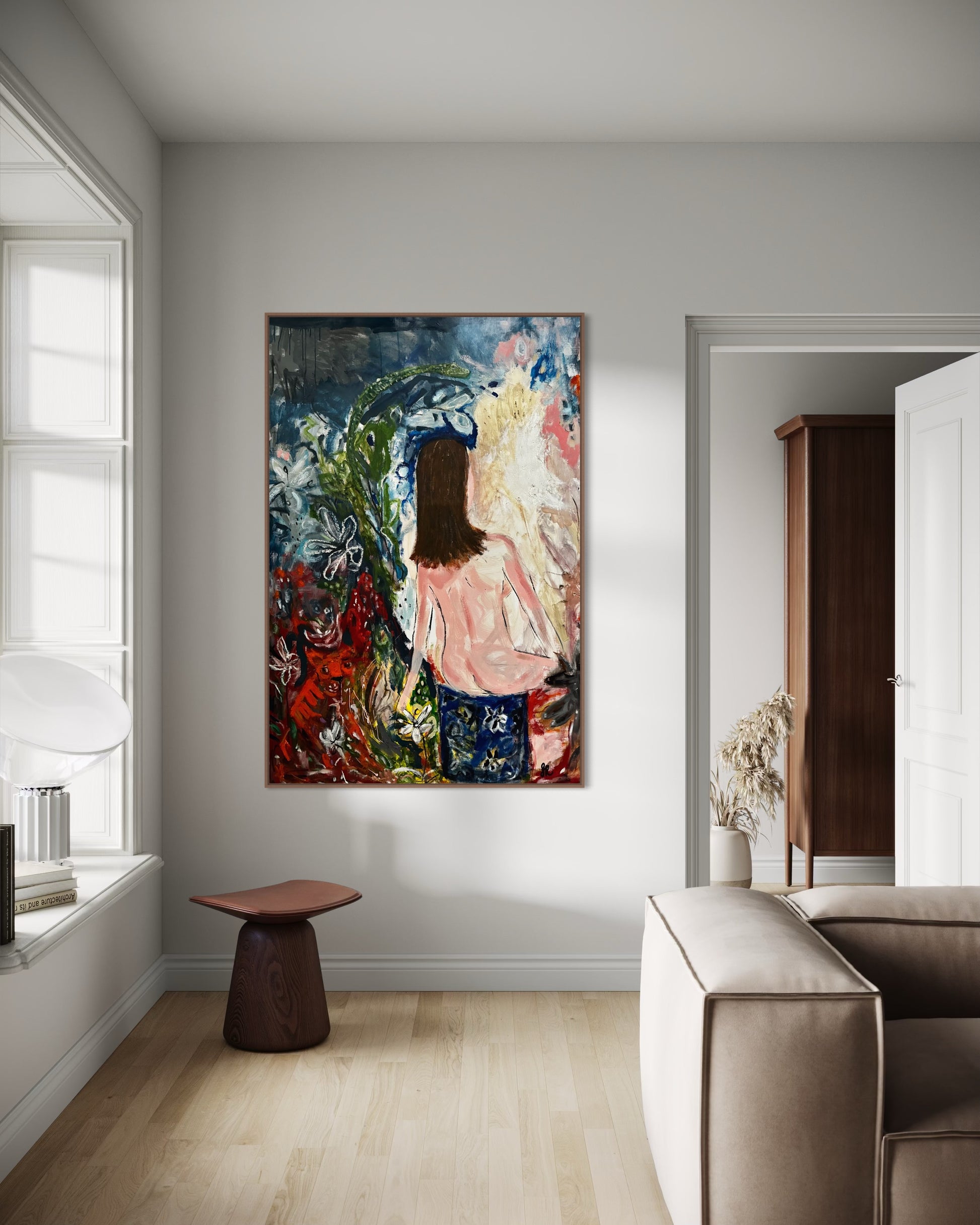 This acrylic, oil, oil stick and sand painting features a figure gazing into a bright light. Her companions are a Tiger, a dog and a snake. Creatures meant to offer protection, longevity and strength.