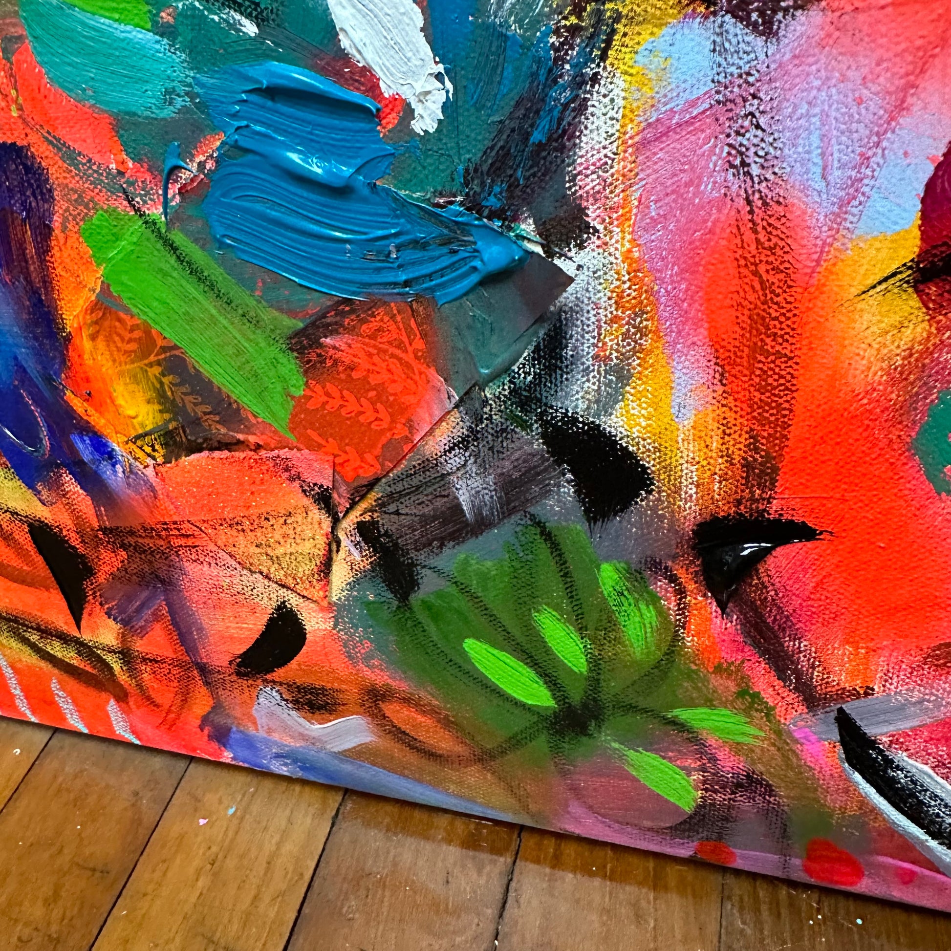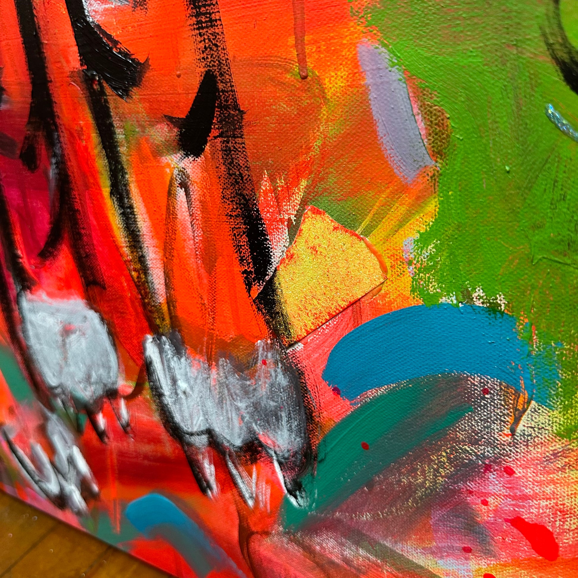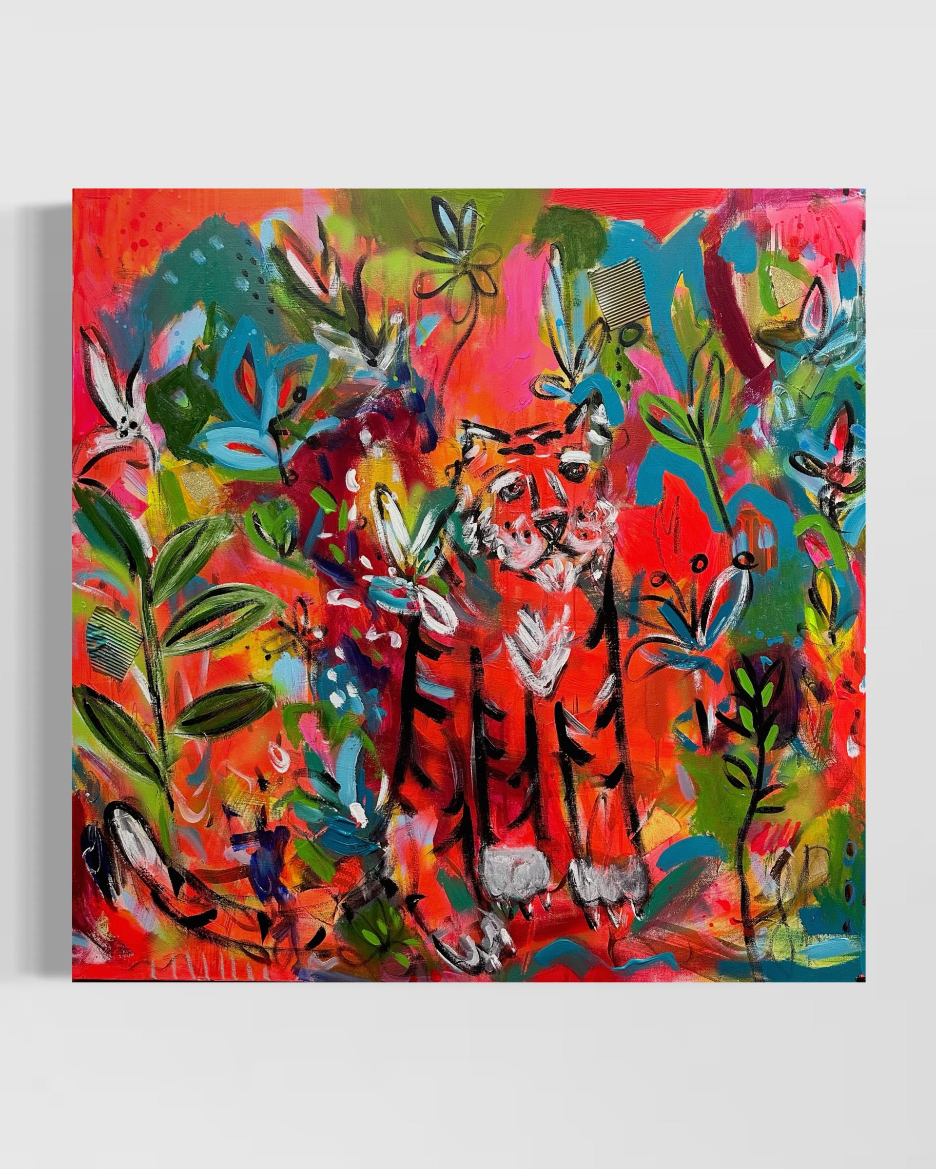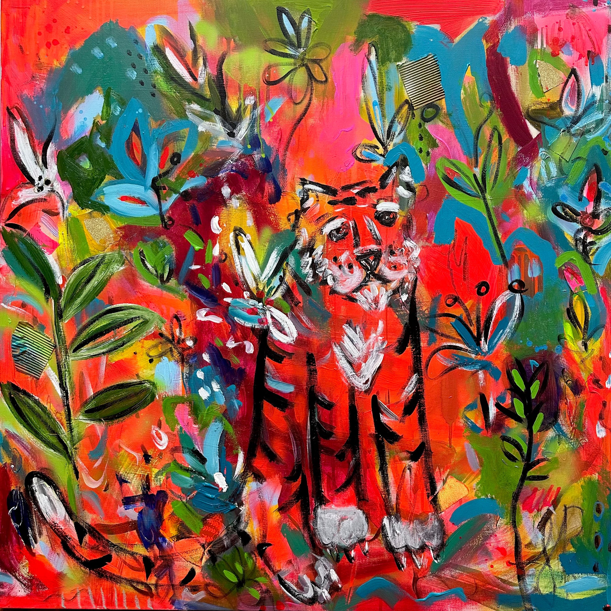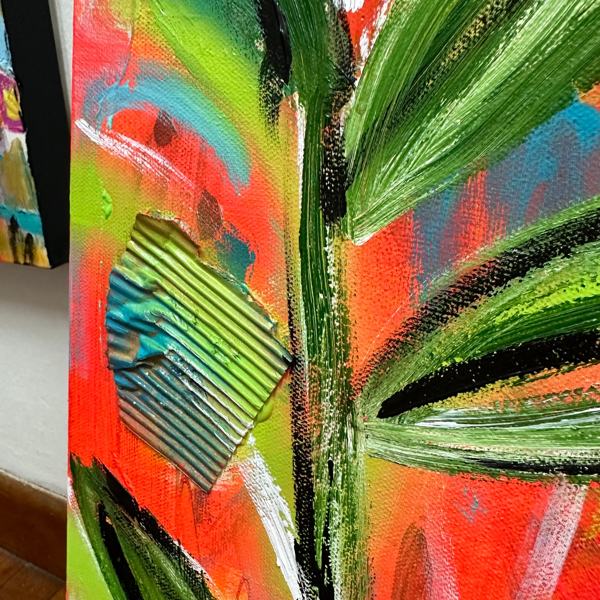 Finding Cover In The Jungle is a super fun abstract landscape. Mixed media such as acrylic, spray paint and paper make this super fun piece pop.