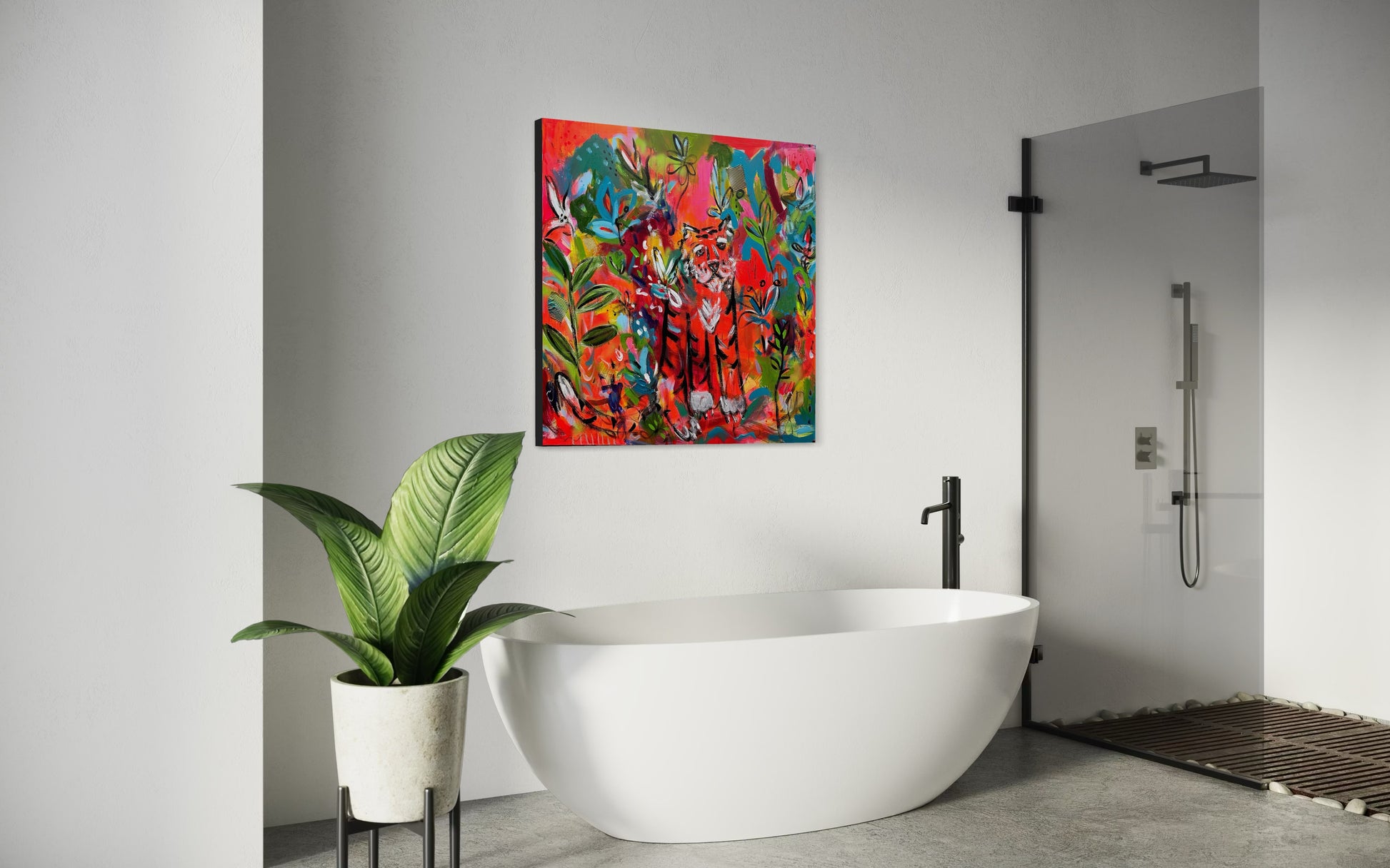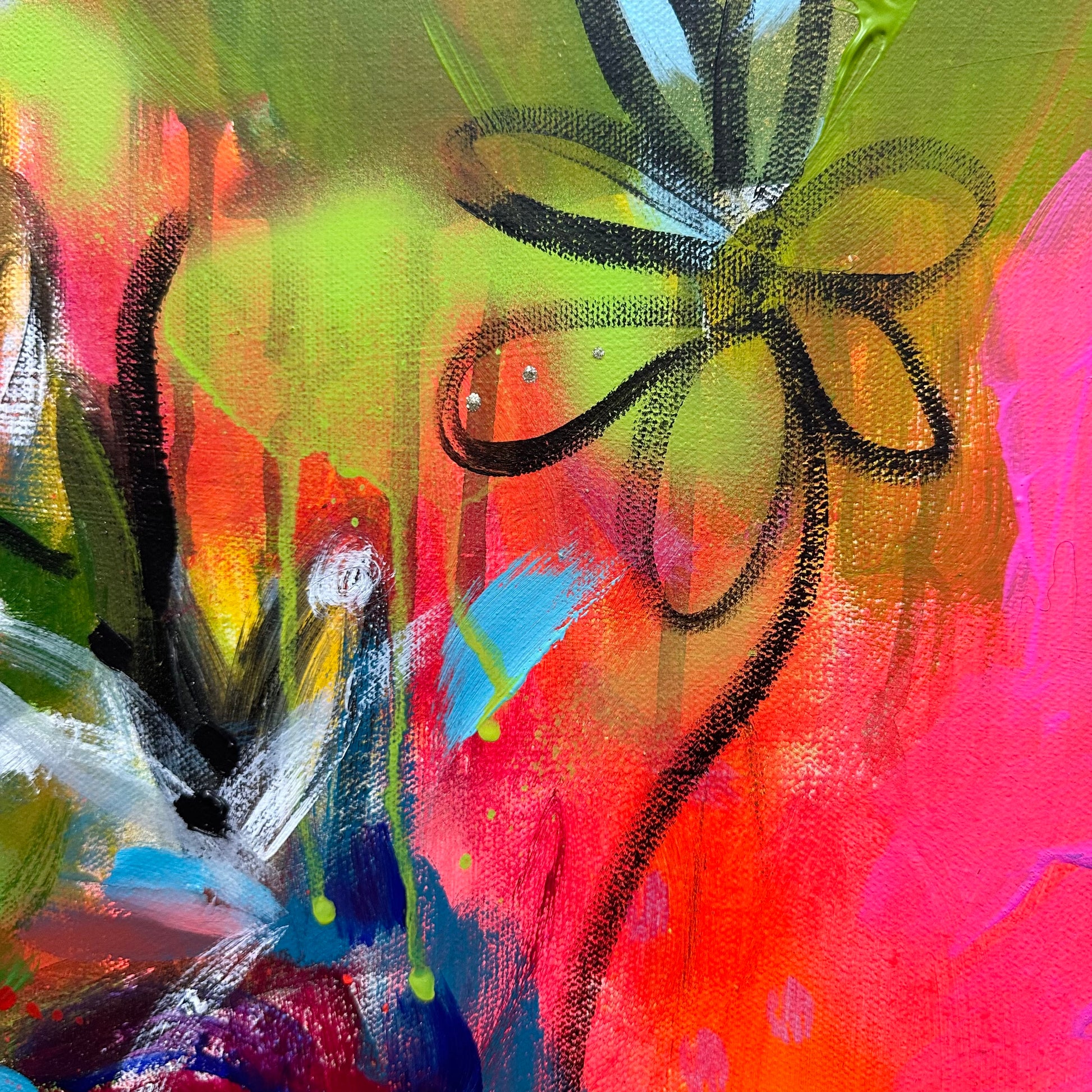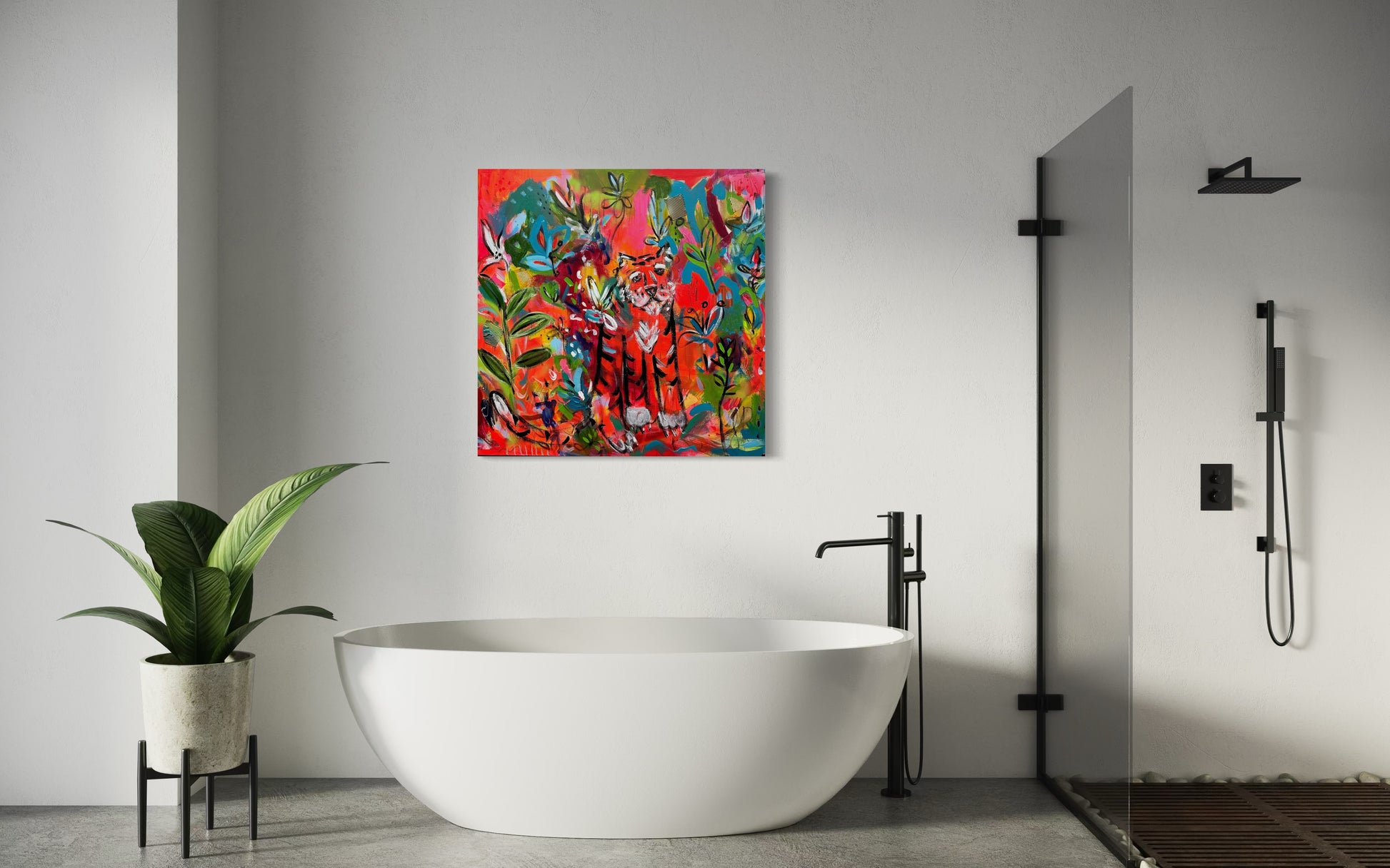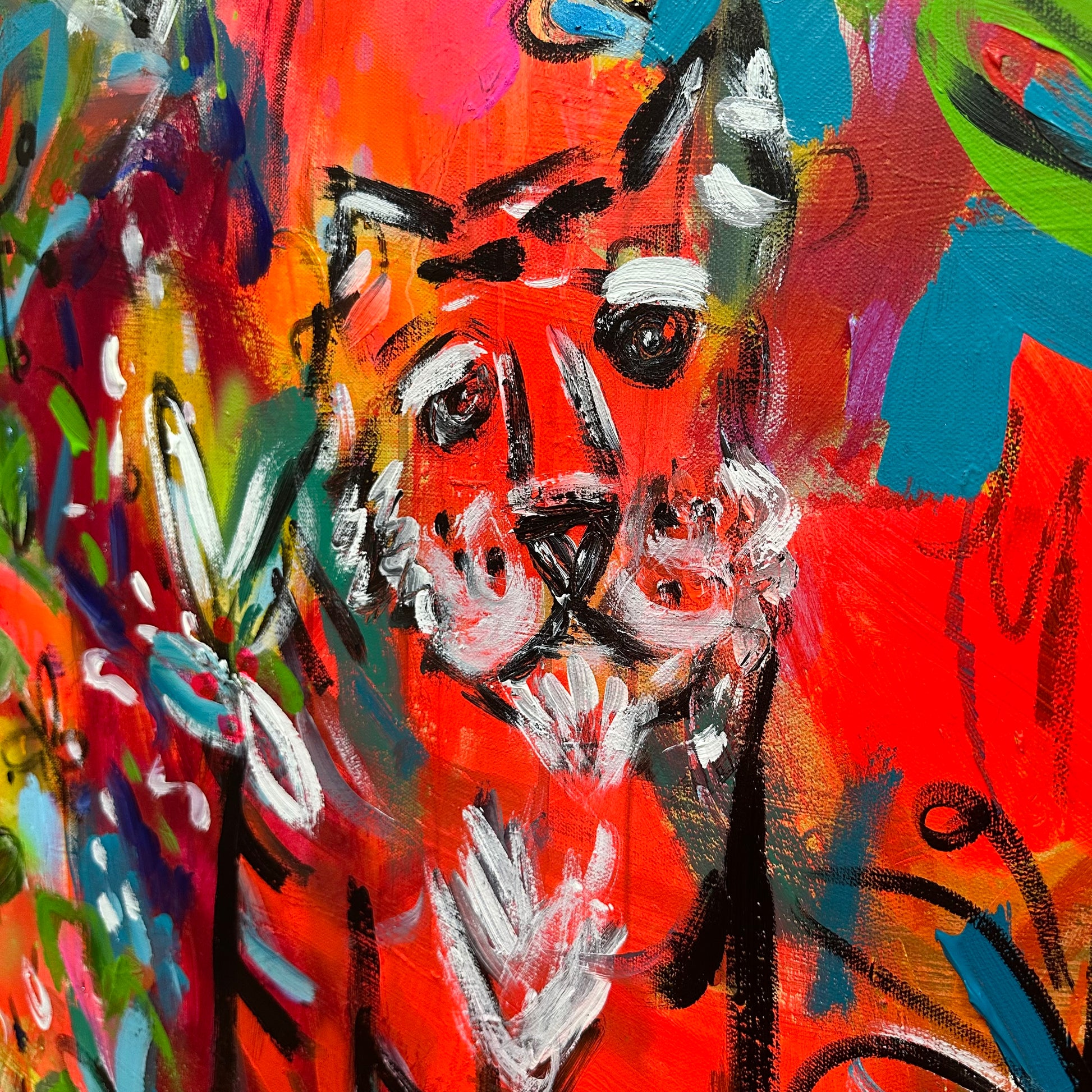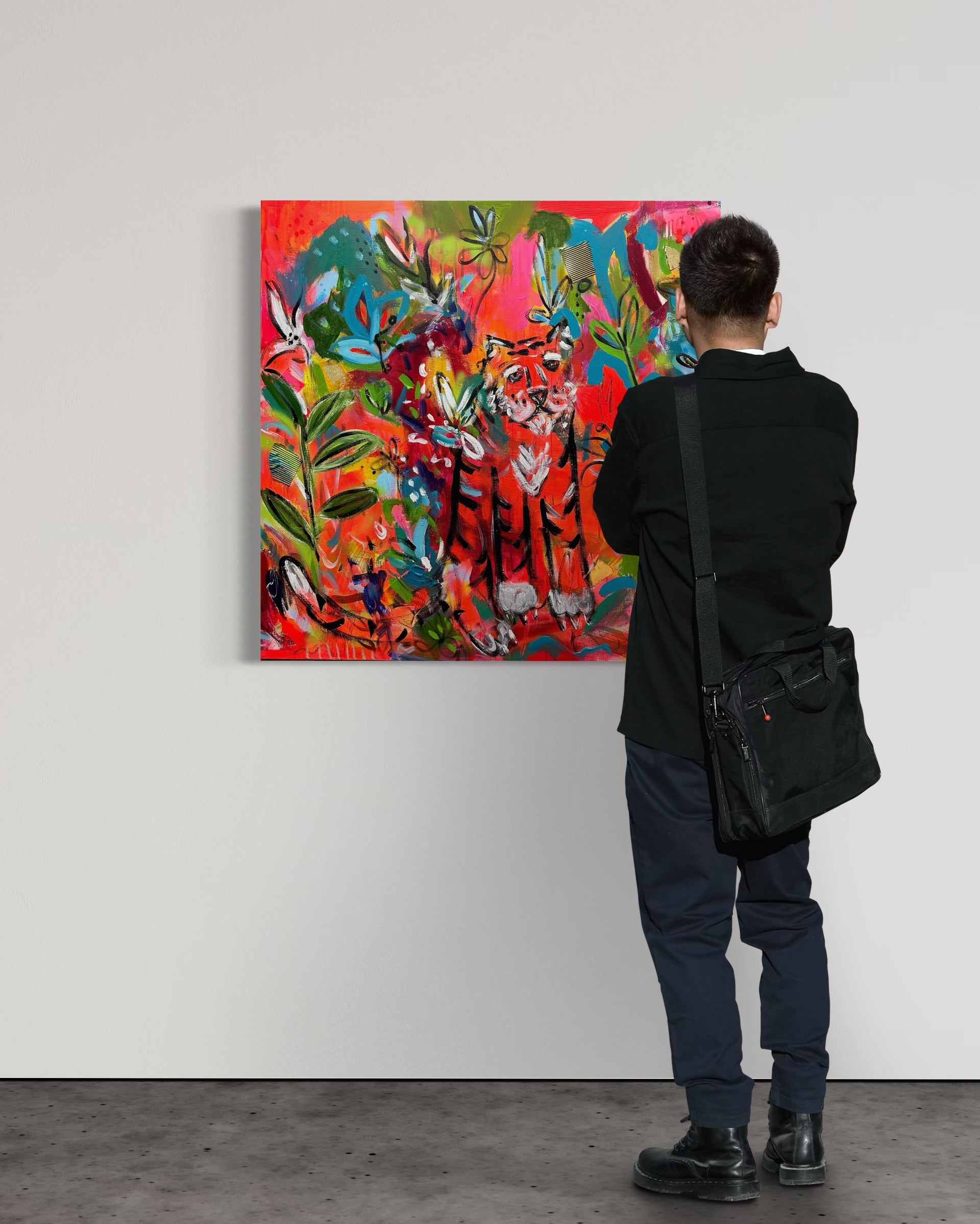 Finding Cover In The Jungle is a super fun abstract landscape. Mixed media such as acrylic, spray paint and paper make this super fun piece pop.