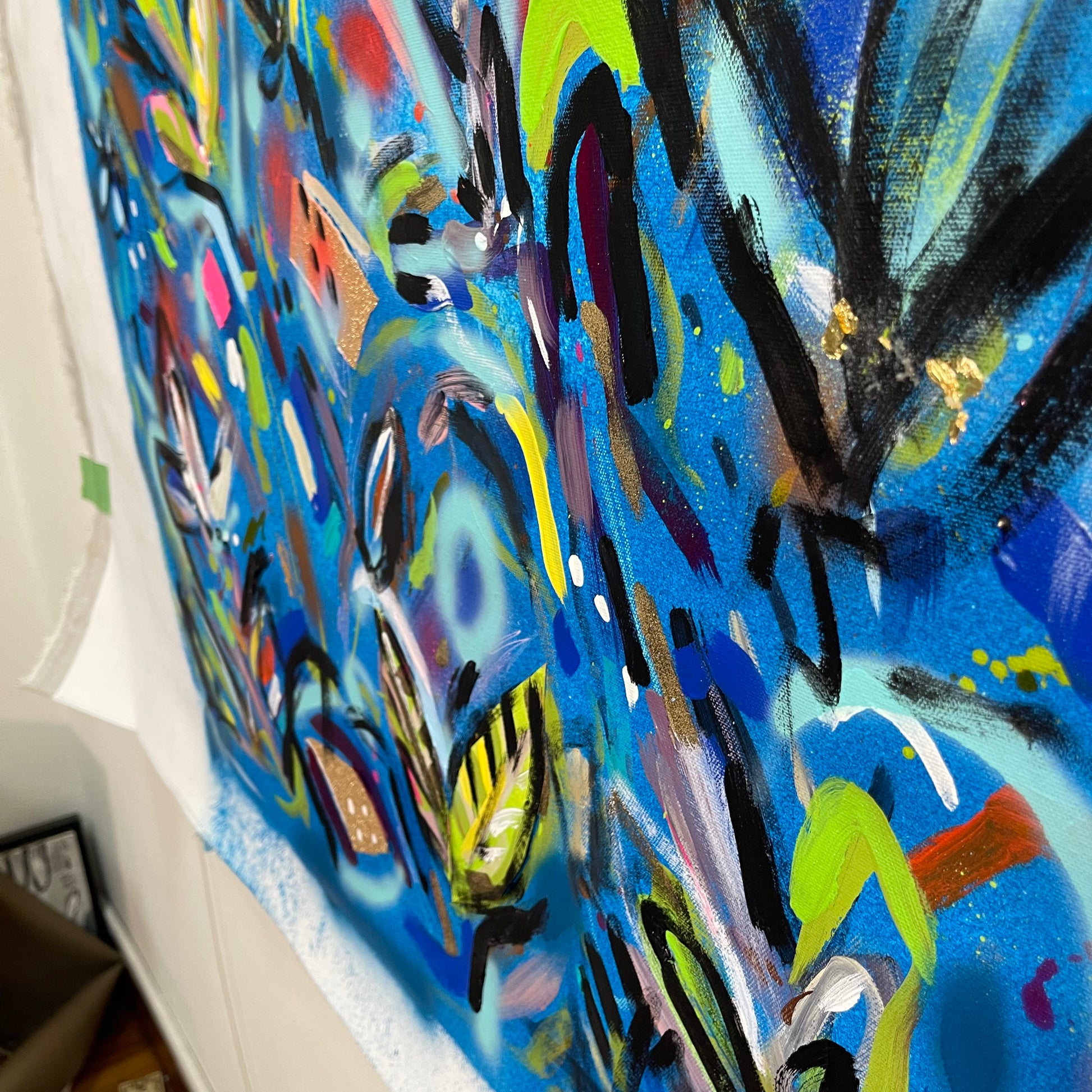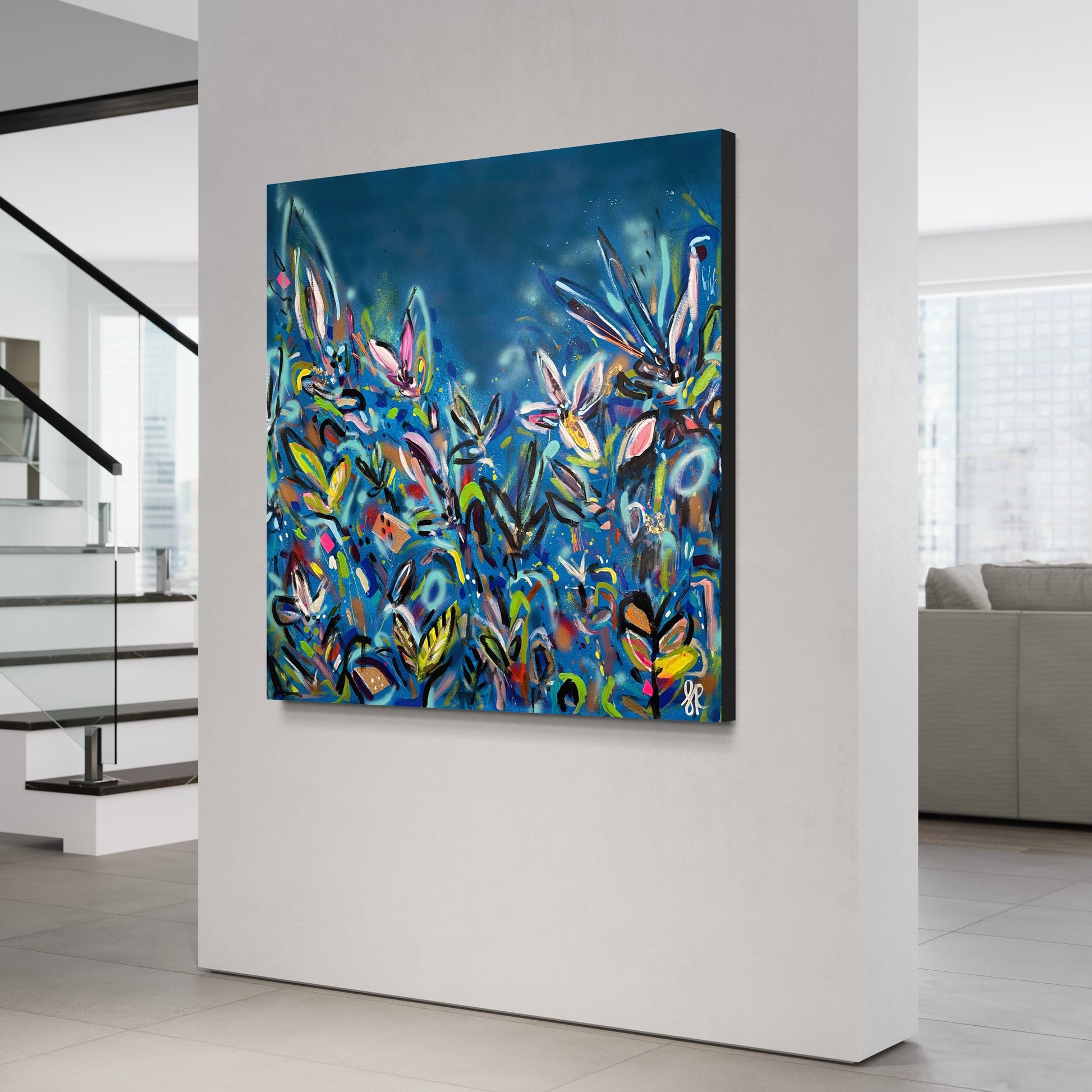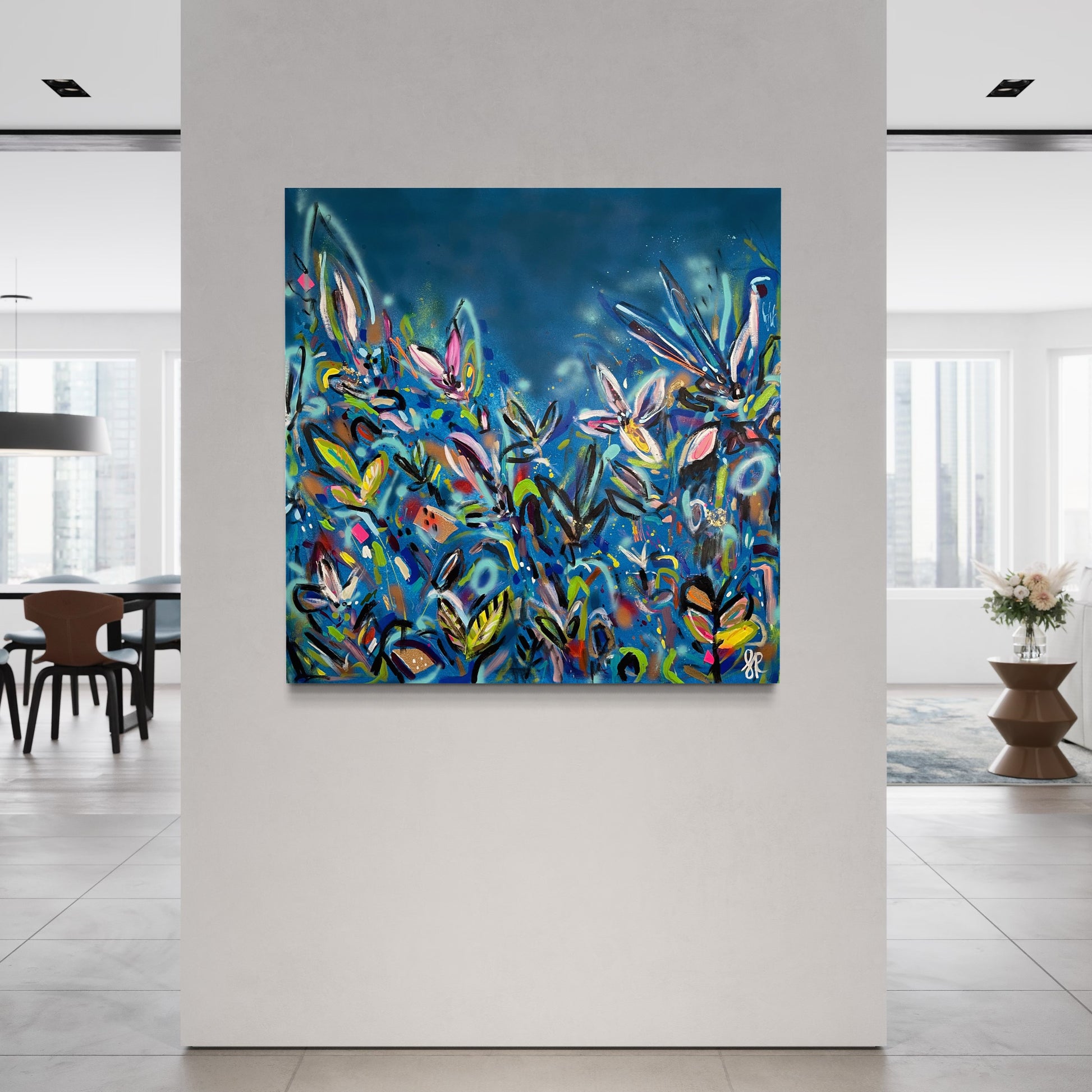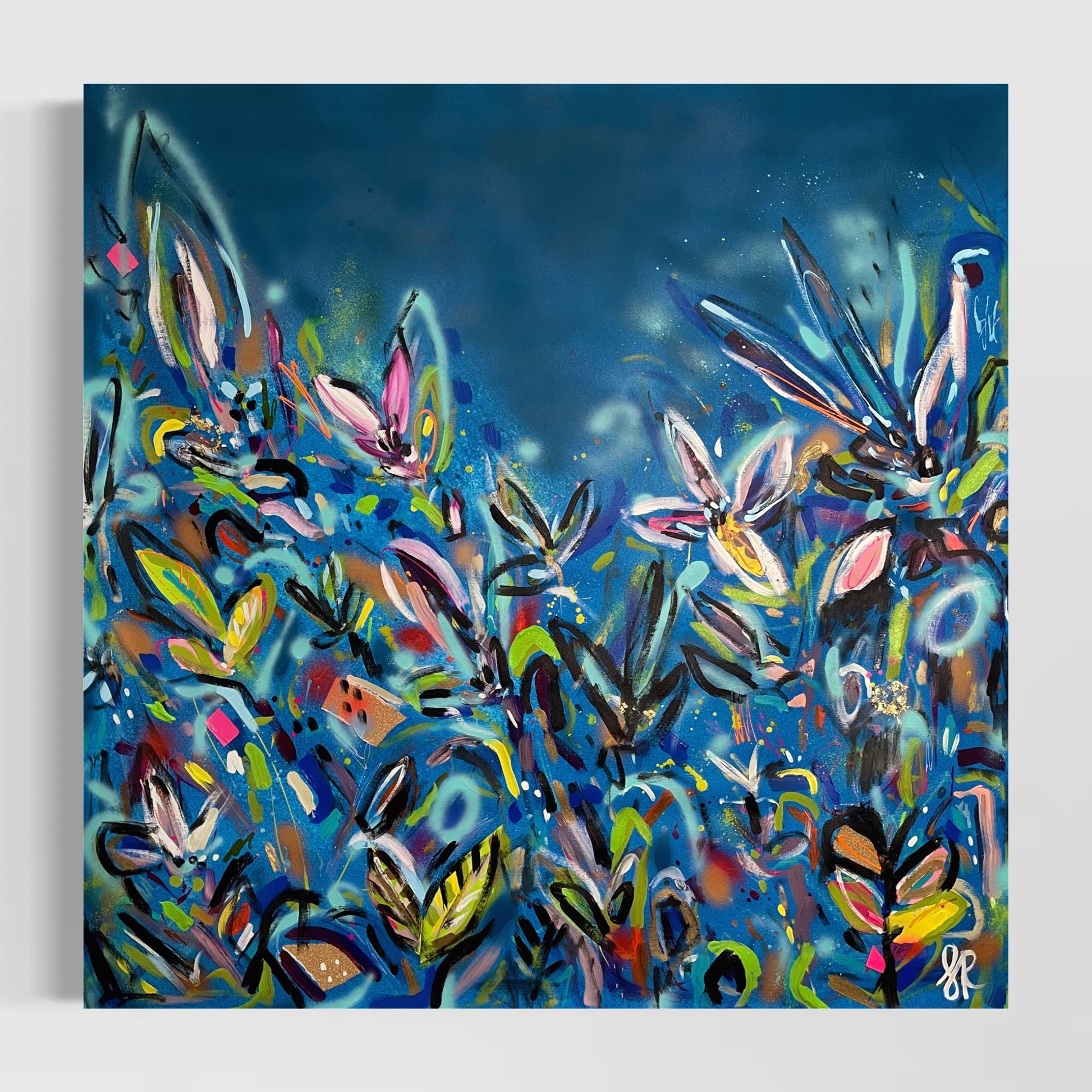 I’ll Never Forget You is a beautiful vibrant mixed abstract landscape comprising of mixed media including acrylic paint, oil pastel, oil stick, ink, sand, glitter and spray paint on 101cm x 101 cm canvas.