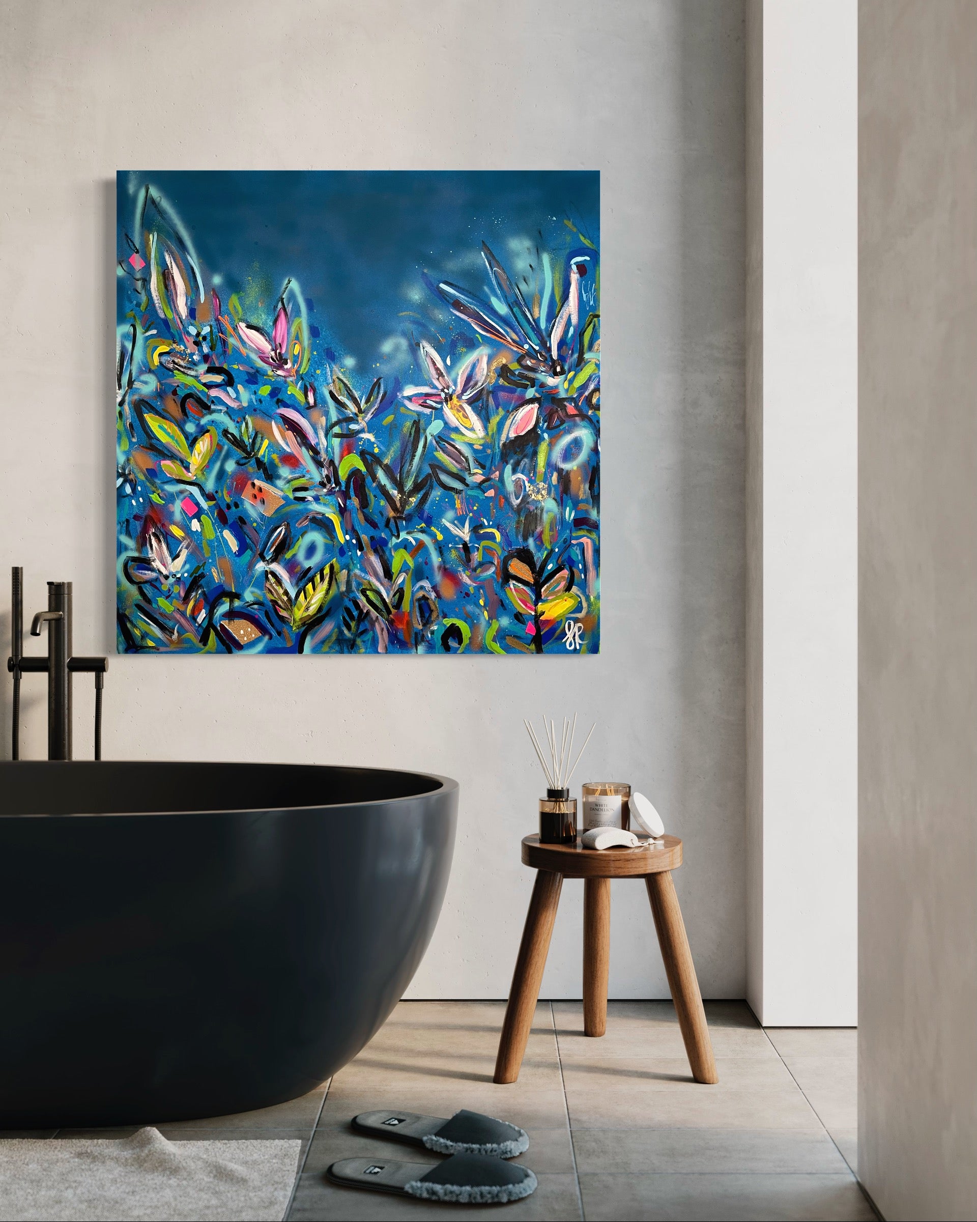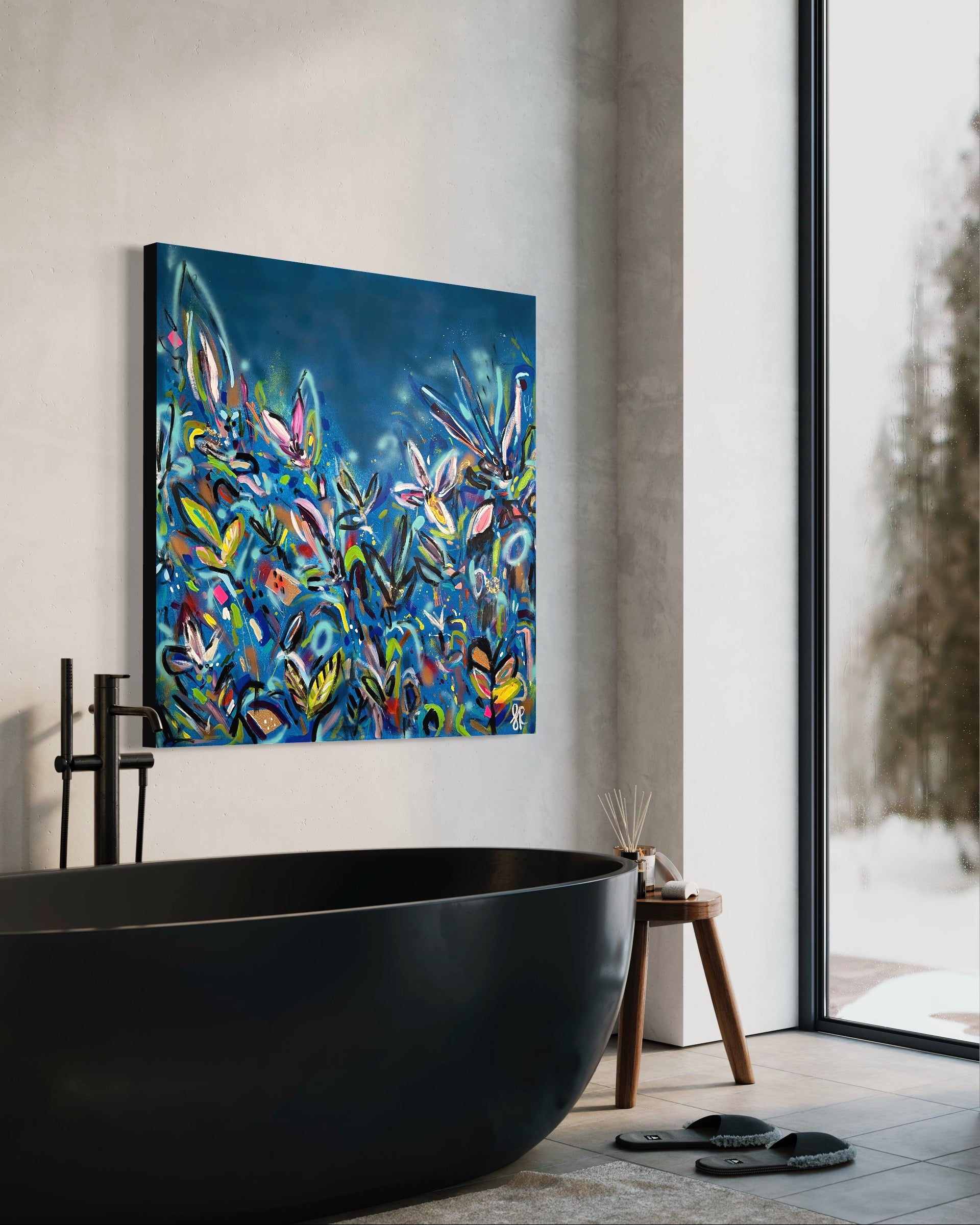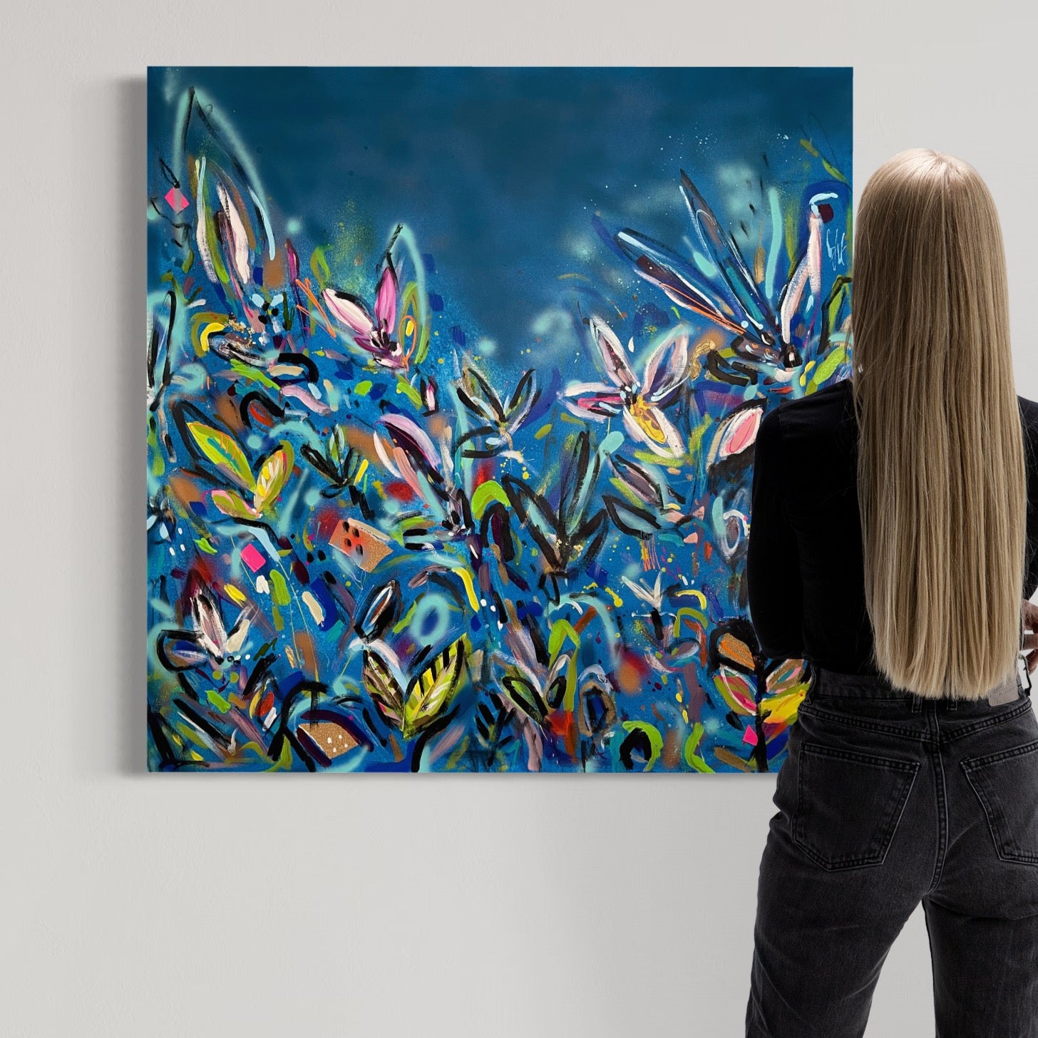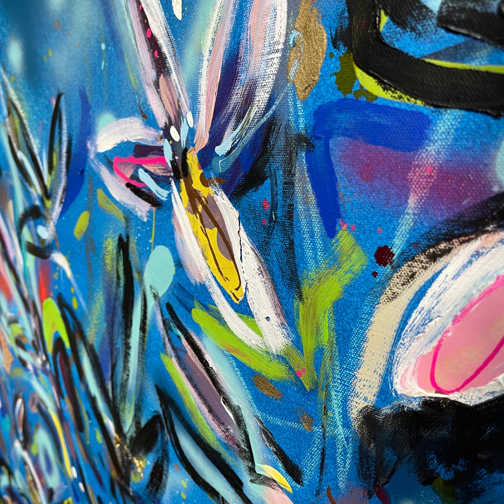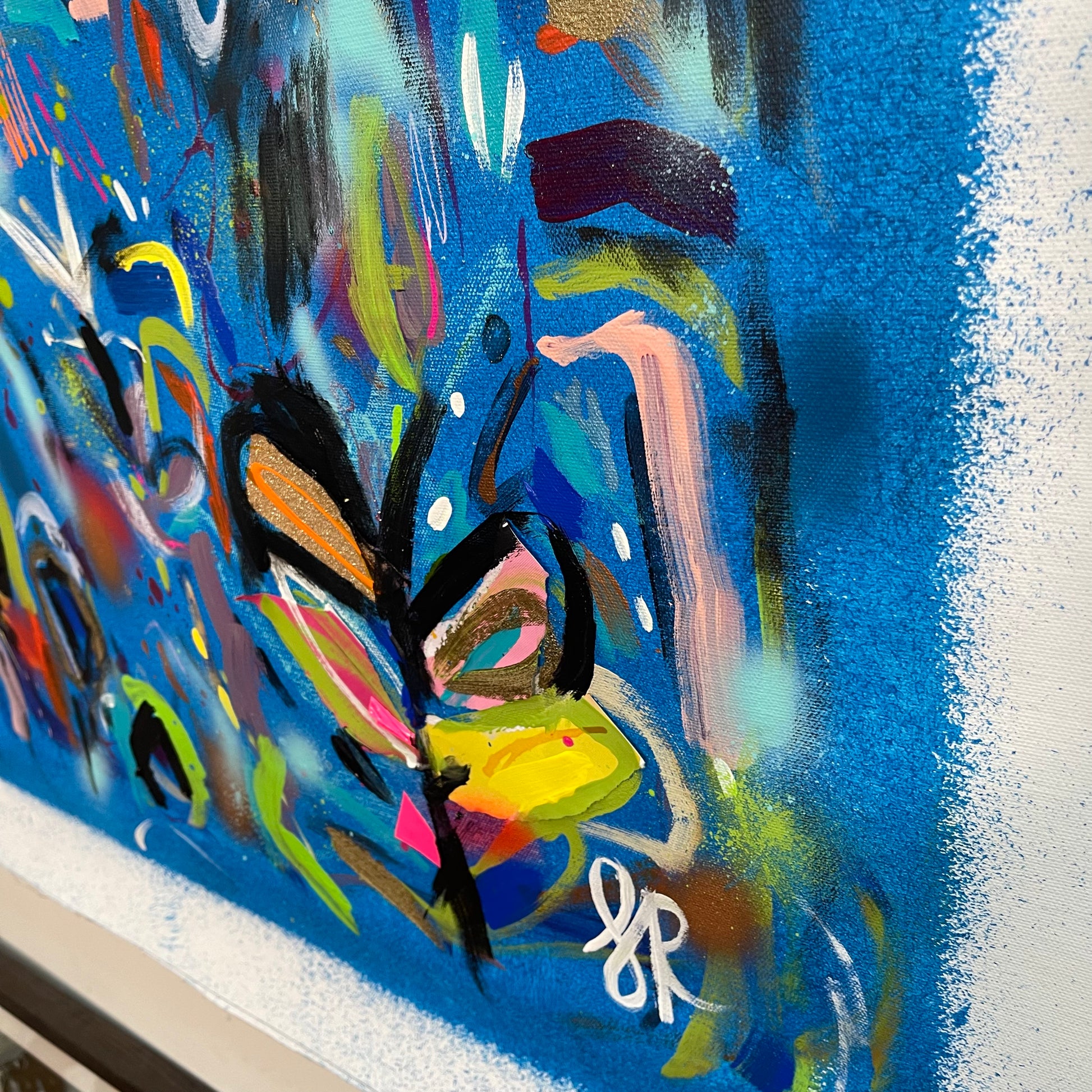 I’ll Never Forget You is a beautiful vibrant mixed abstract landscape comprising of mixed media including acrylic paint, oil pastel, oil stick, ink, sand, glitter and spray paint on 101cm x 101 cm canvas.