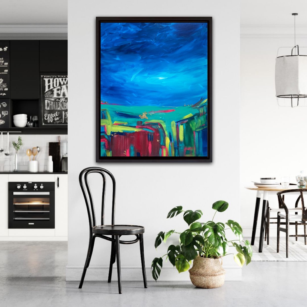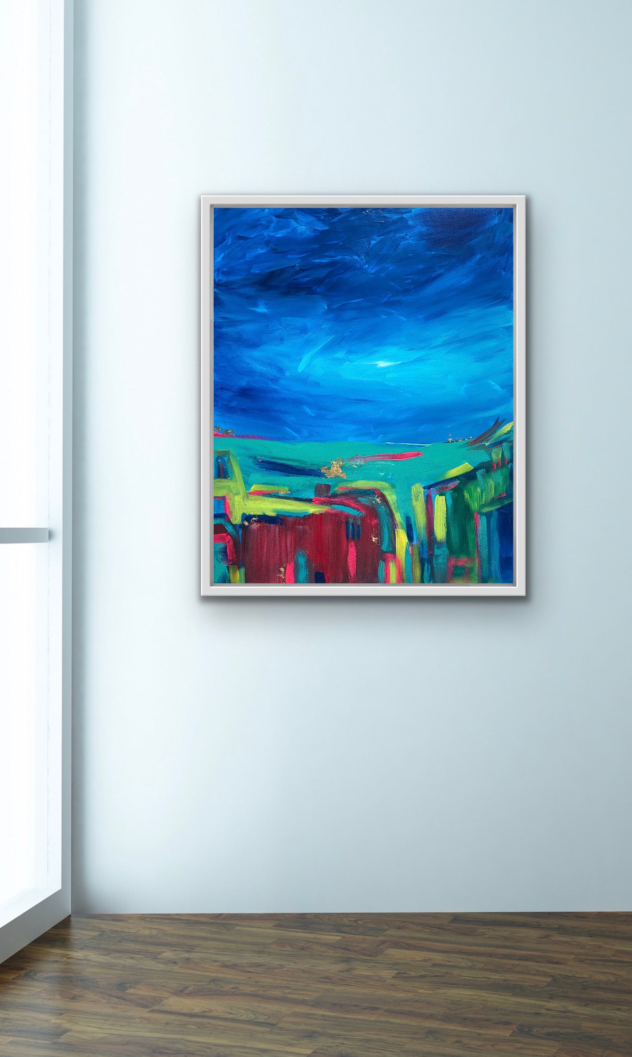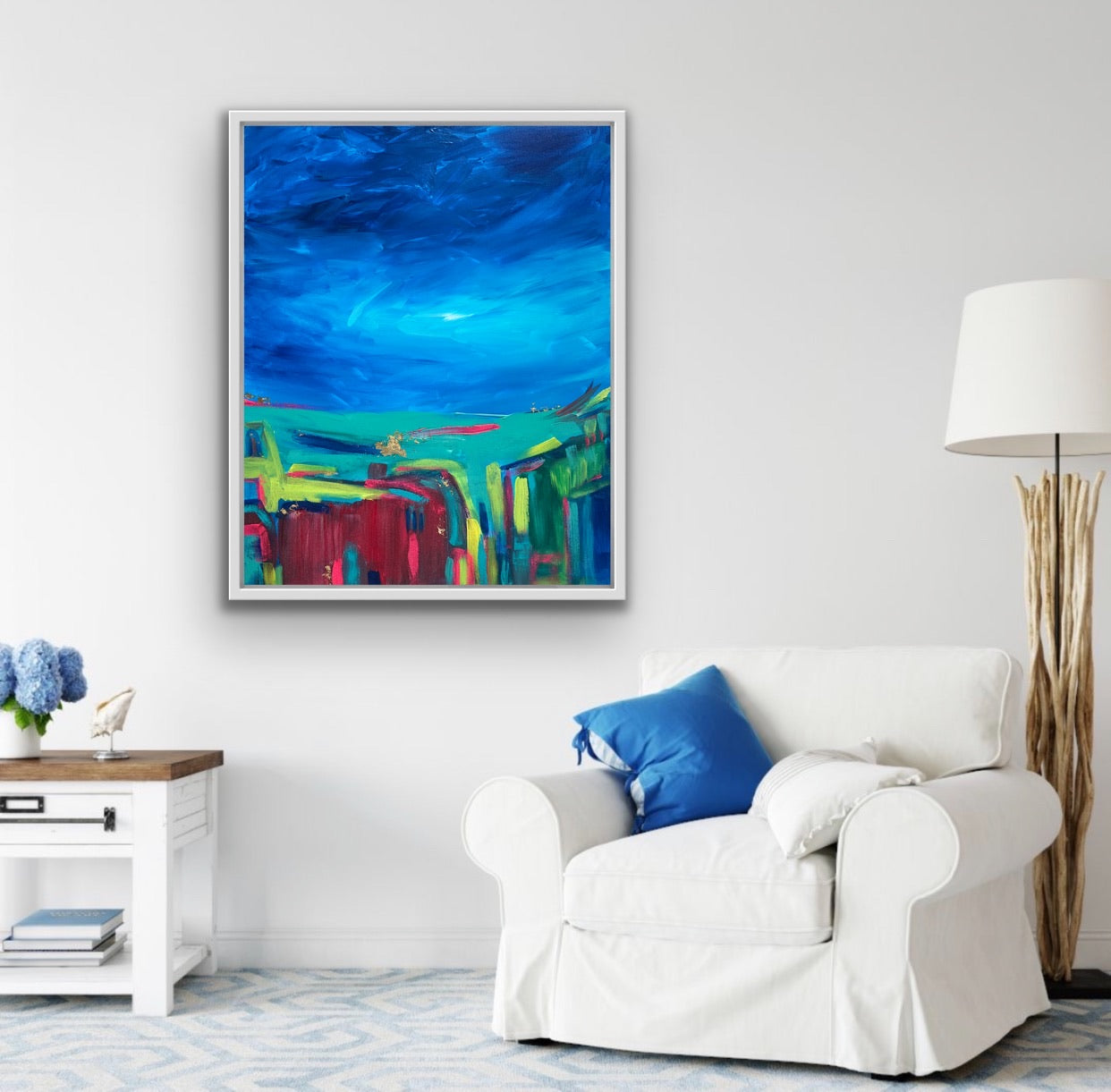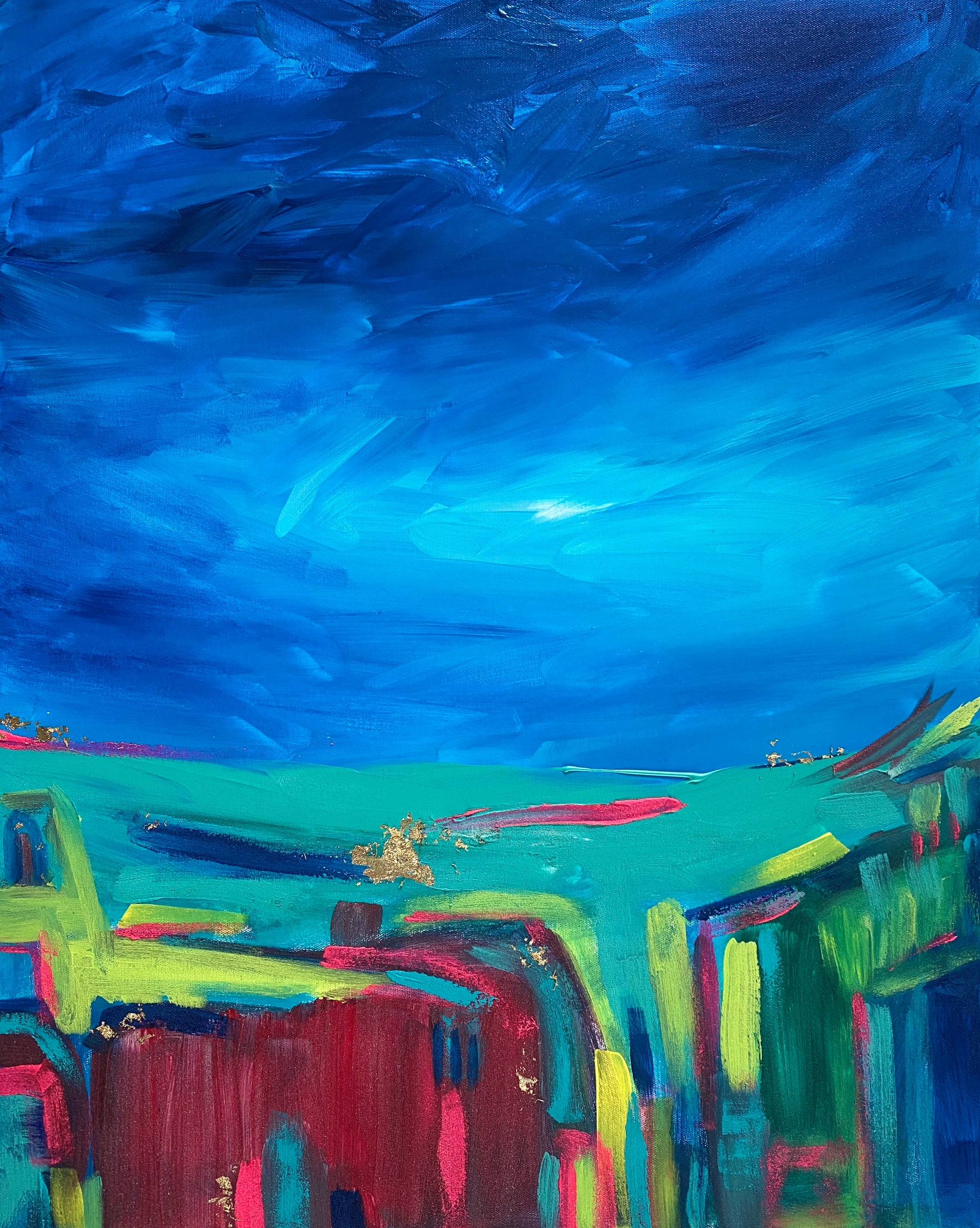 Lands End is an abstract landscape on 30” x 24” stretched canvas. Textured and iridescent in places.