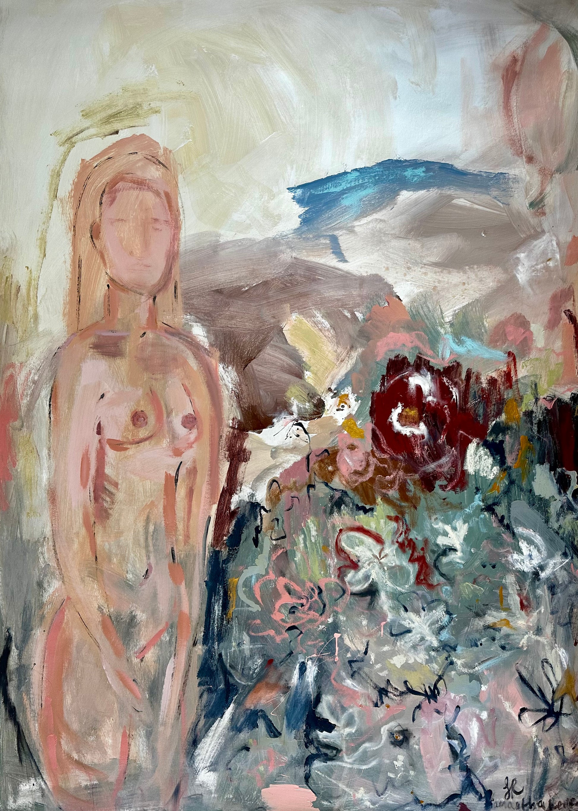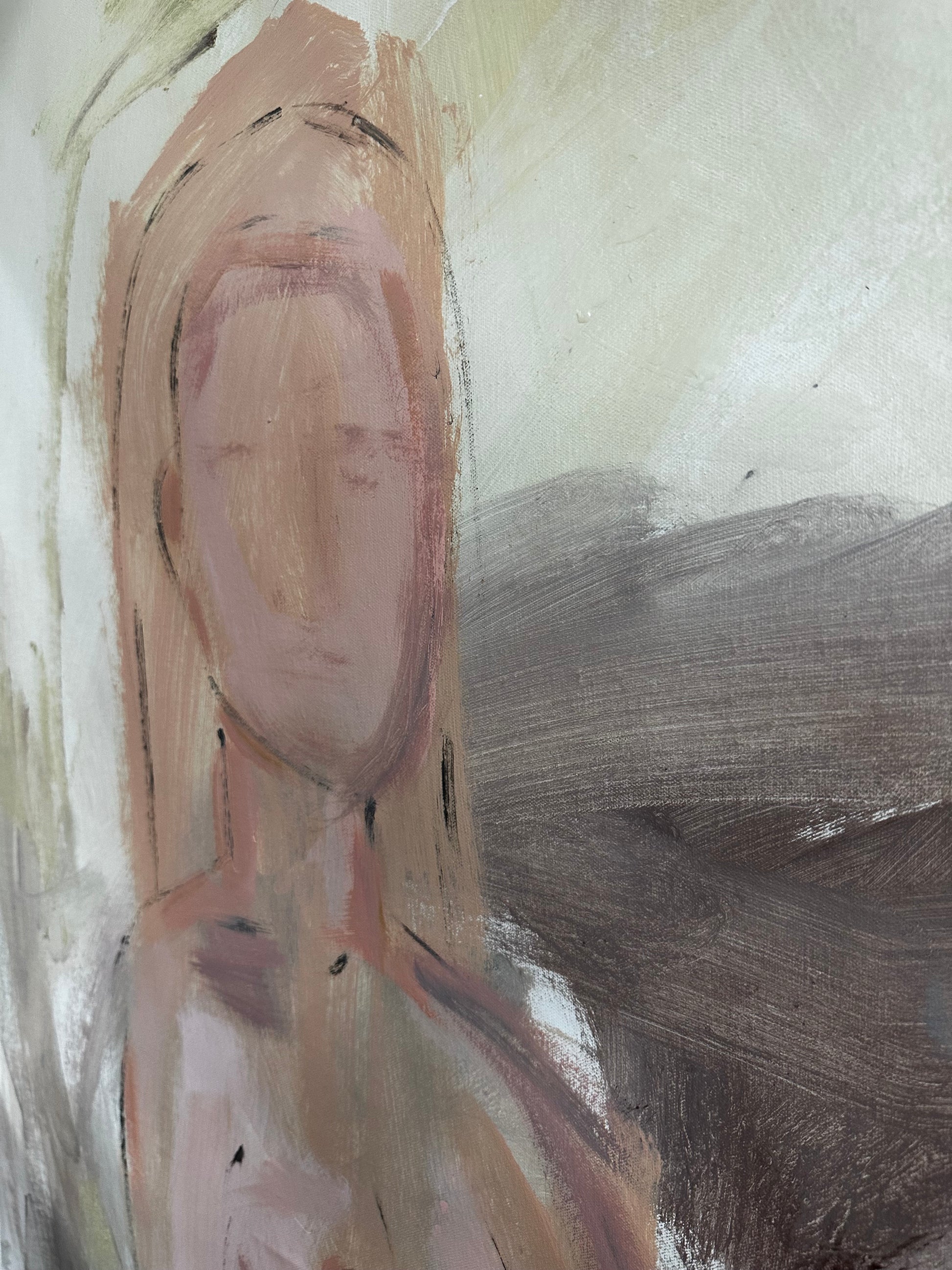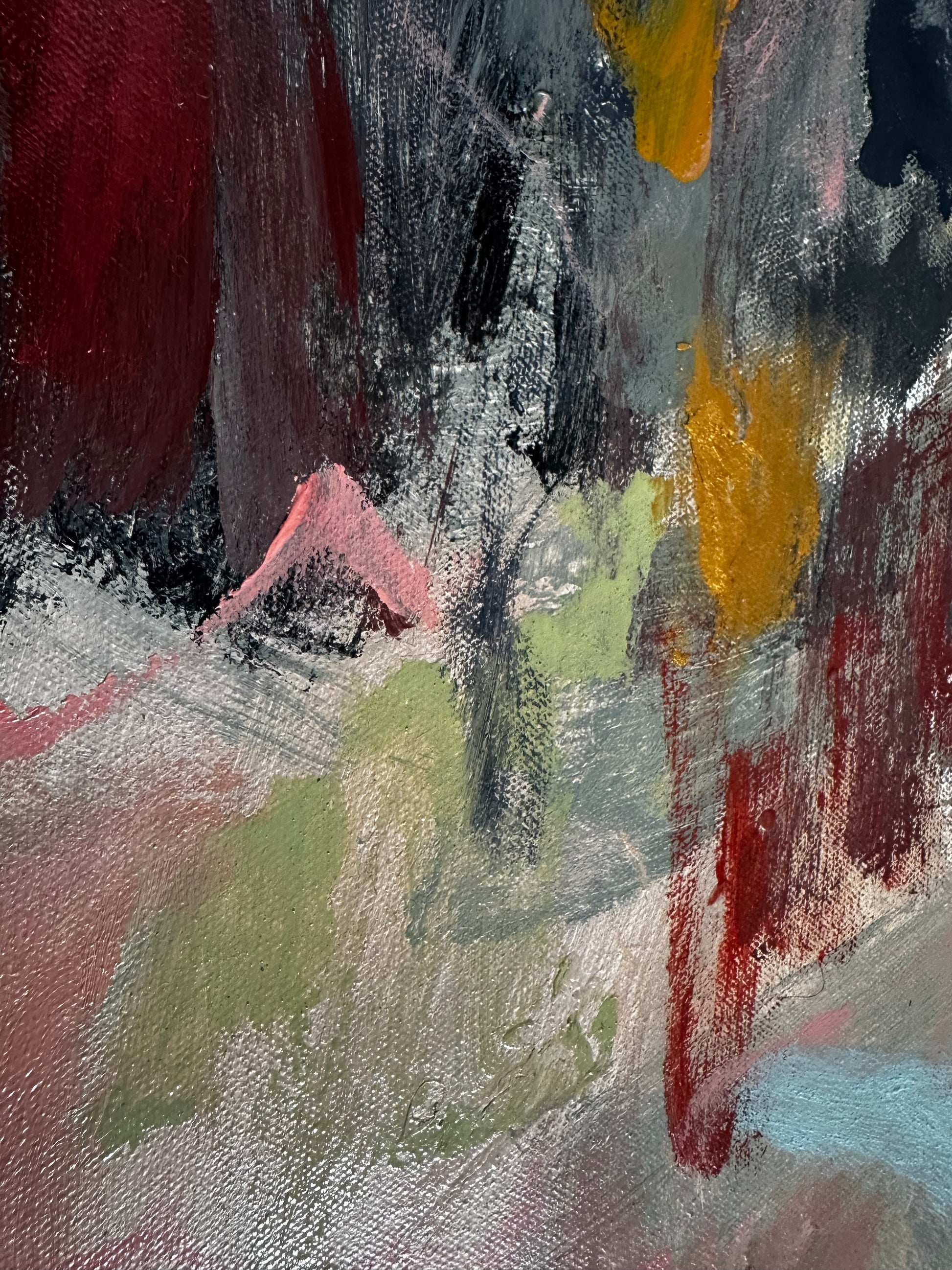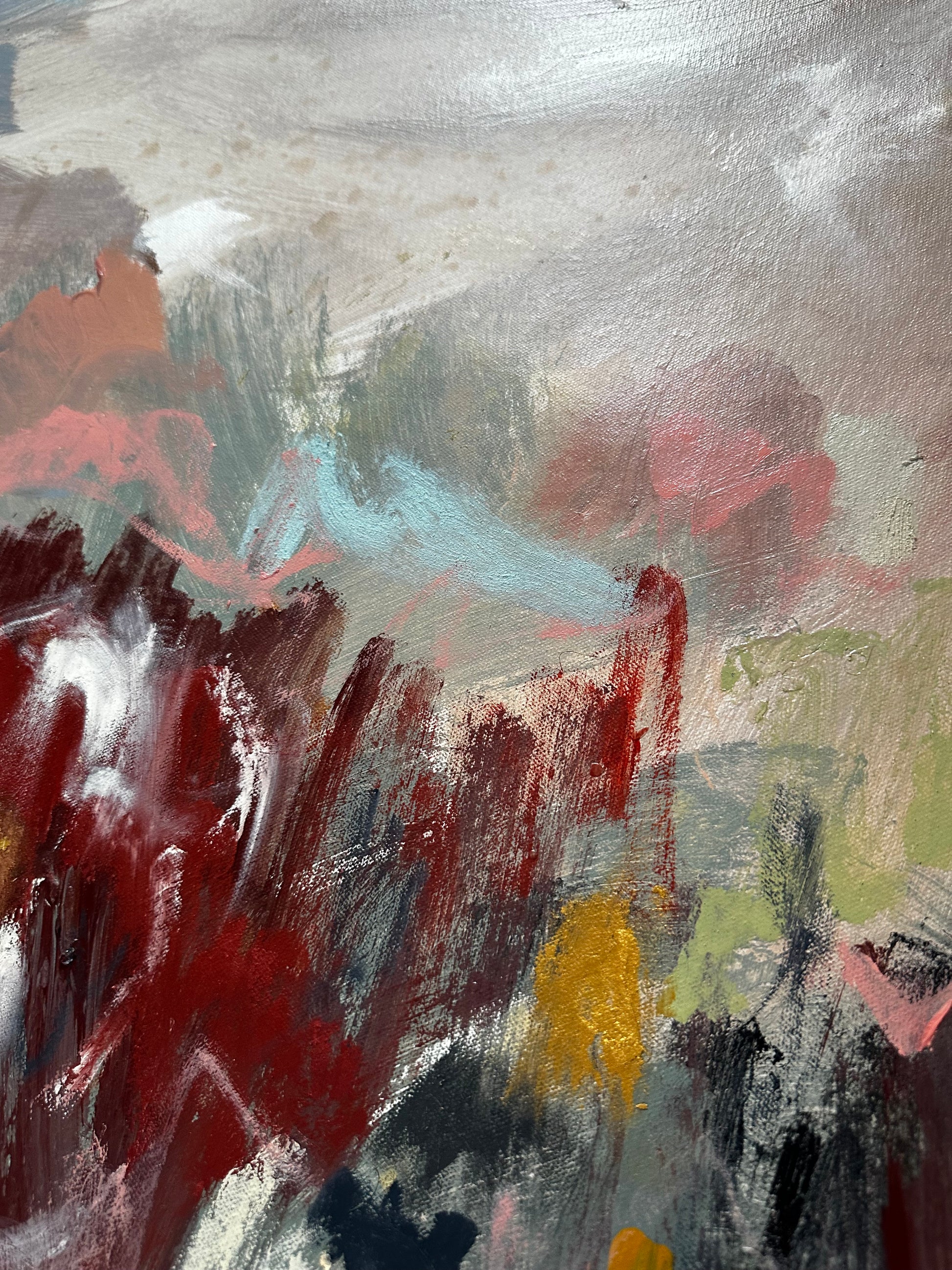 On The Moors is a beautiful and serene figurative landscape. Muted tones with an intense pop of red. This painting symbolises how I feel when I am in the British landscape. Home territory that I feel my soul feels connected to through its comfort and familiarity.