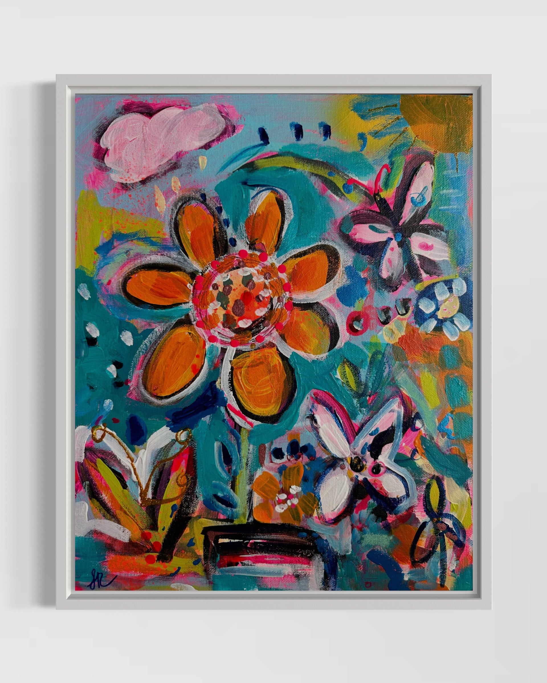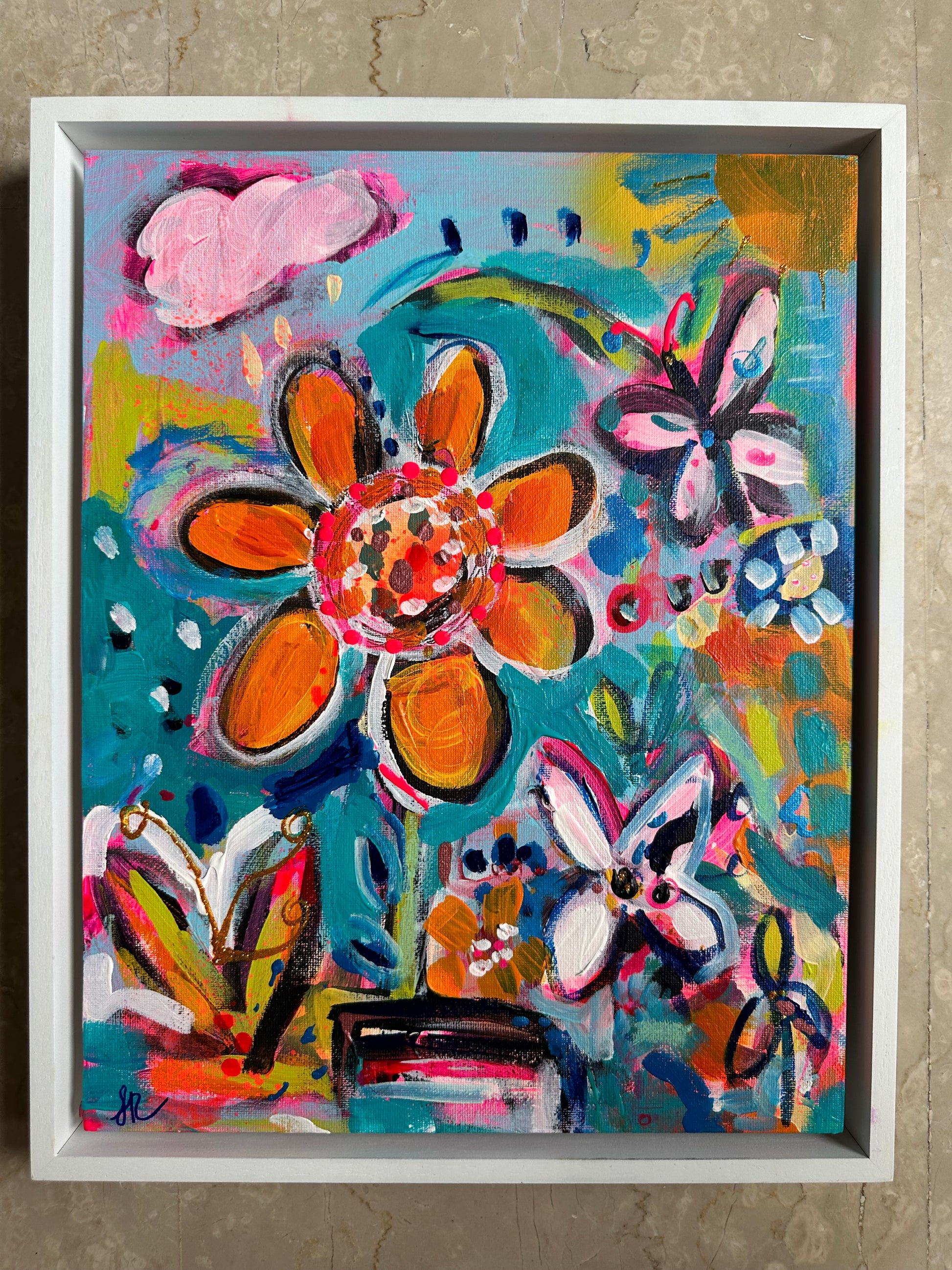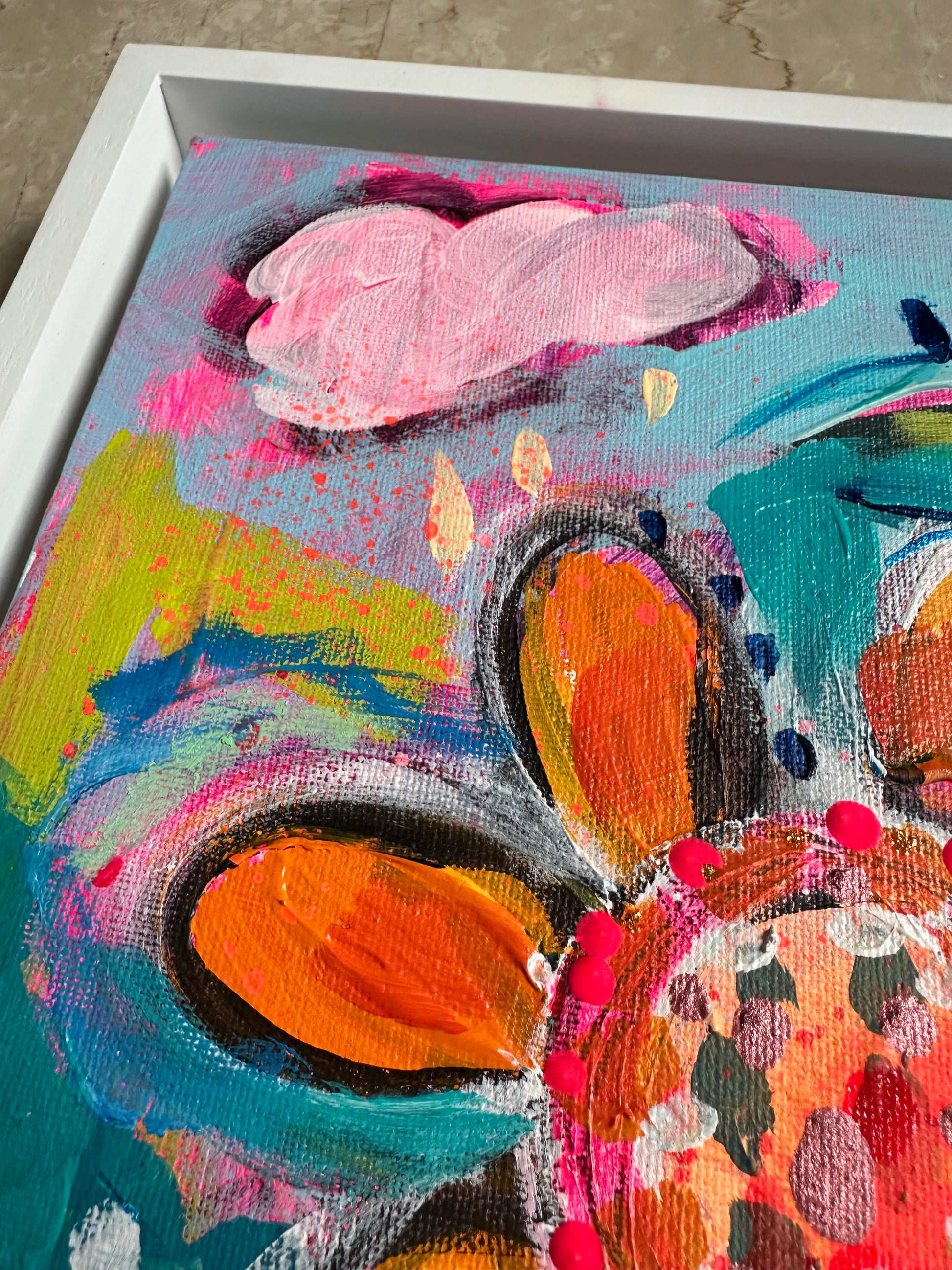 mixed media on board framed in white wood