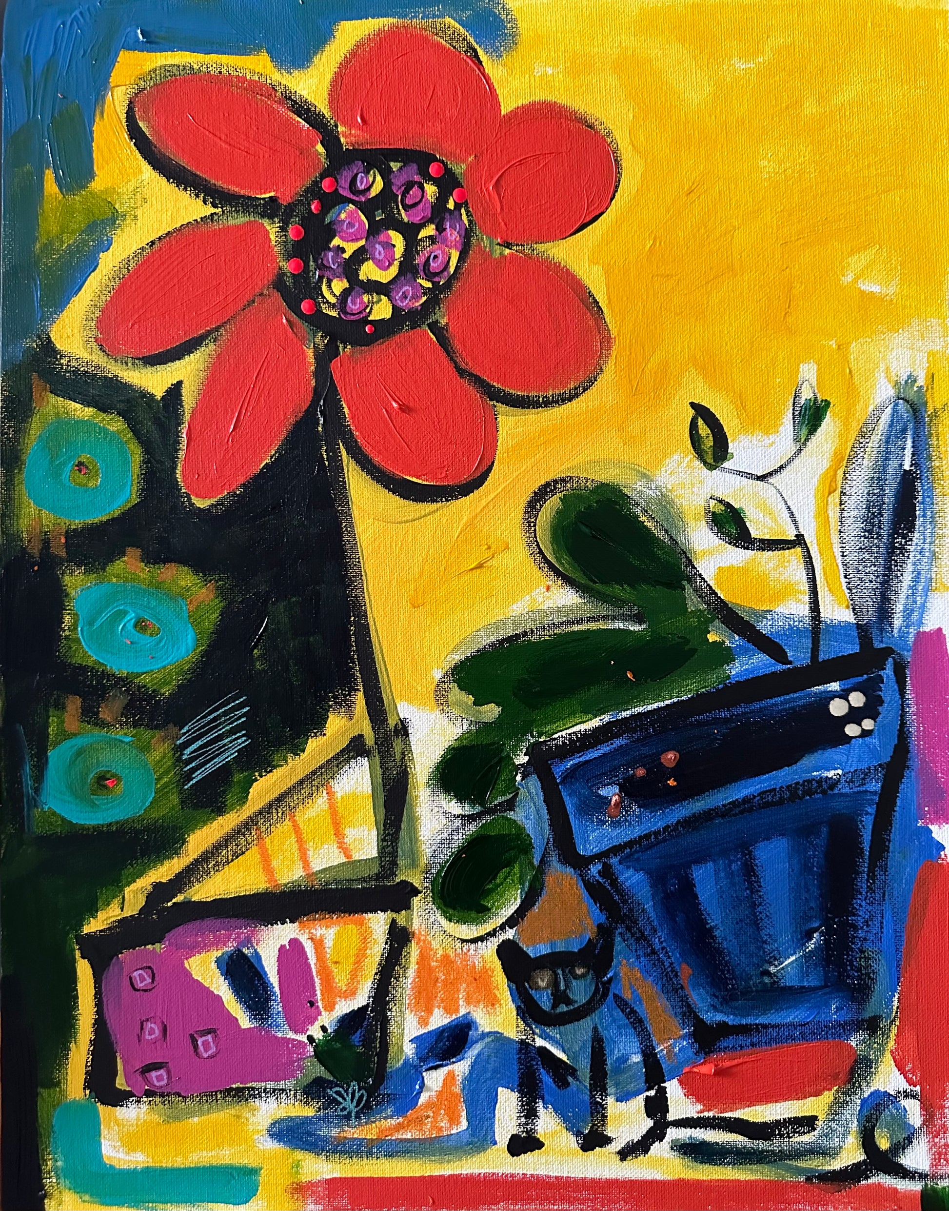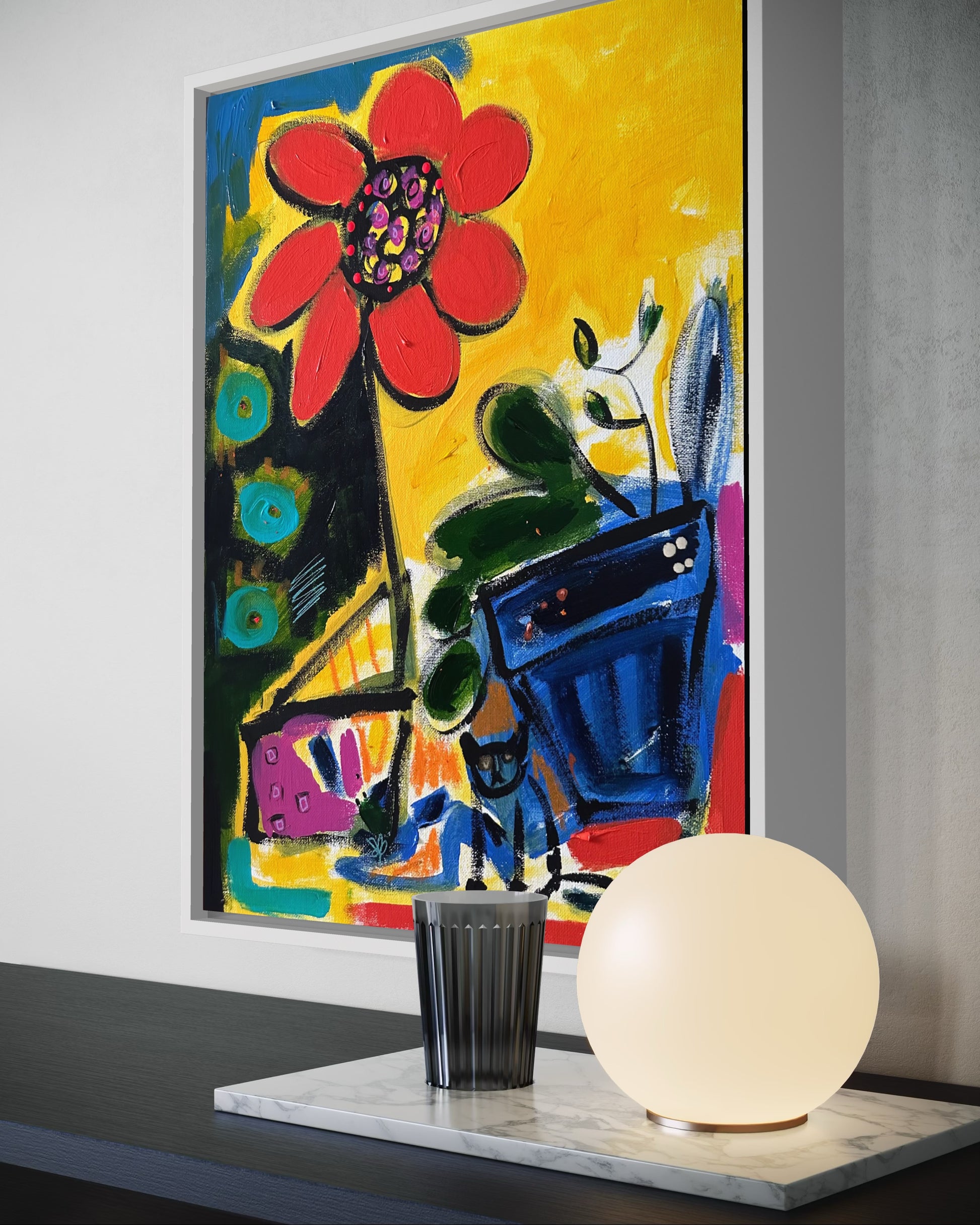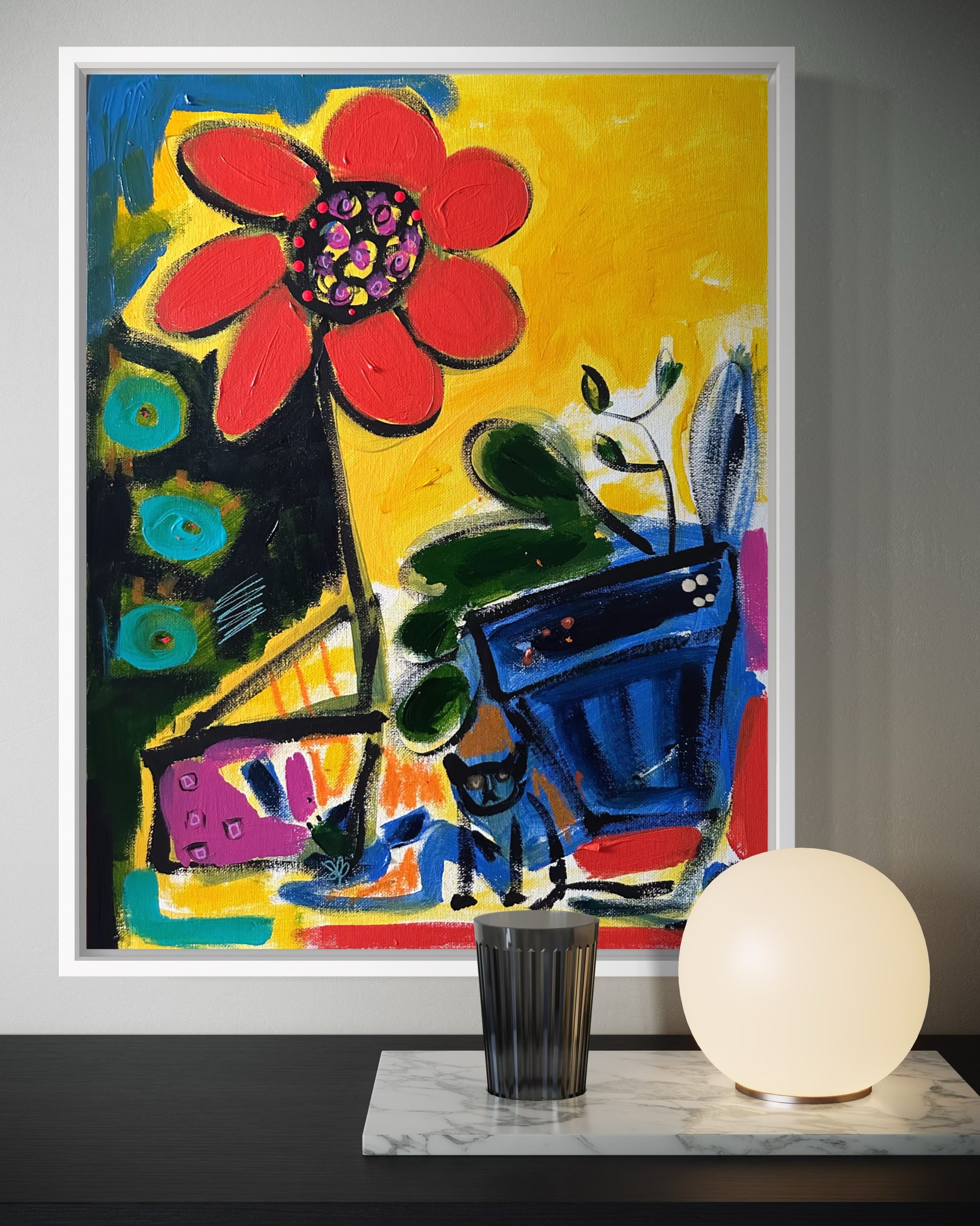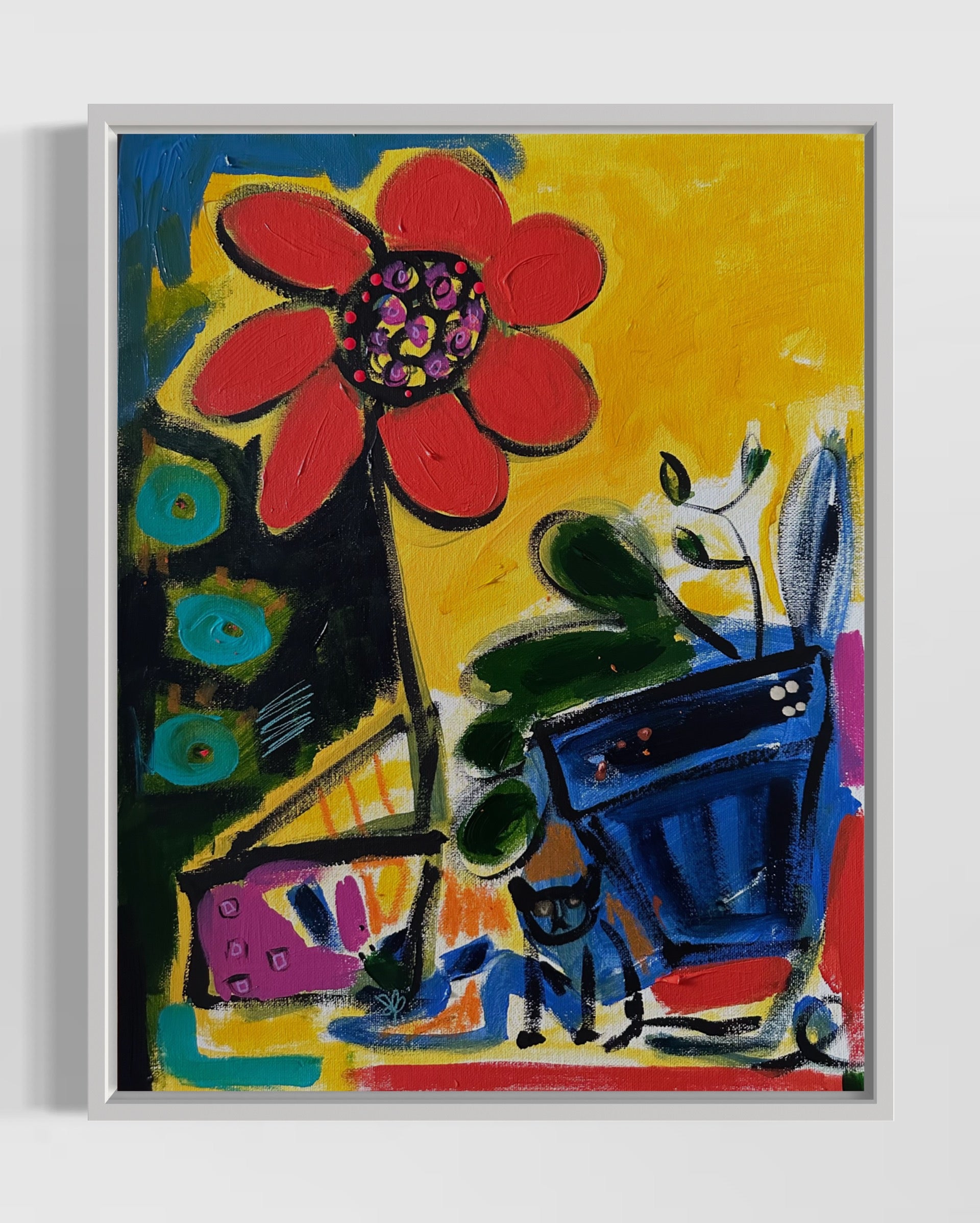 Acrylic, ink, marker and pastel on canvas framed in white wood,