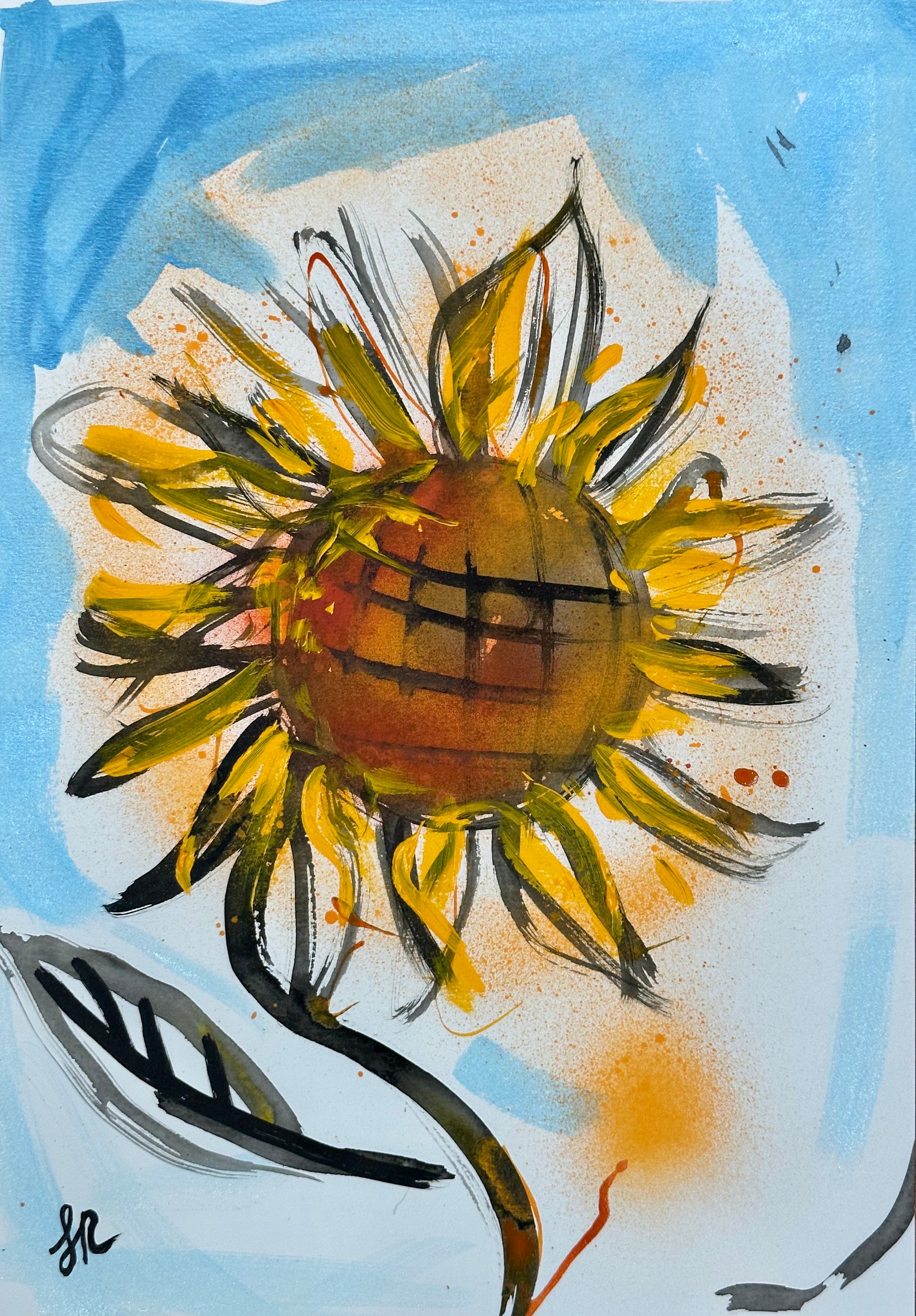 Italian Summer is a mixed media painting depicting a sunflower. Inspired by a recent trip to Italy. Mixed media includes Chinese Ink, acrylic ink, acrylic paint and spray paint.