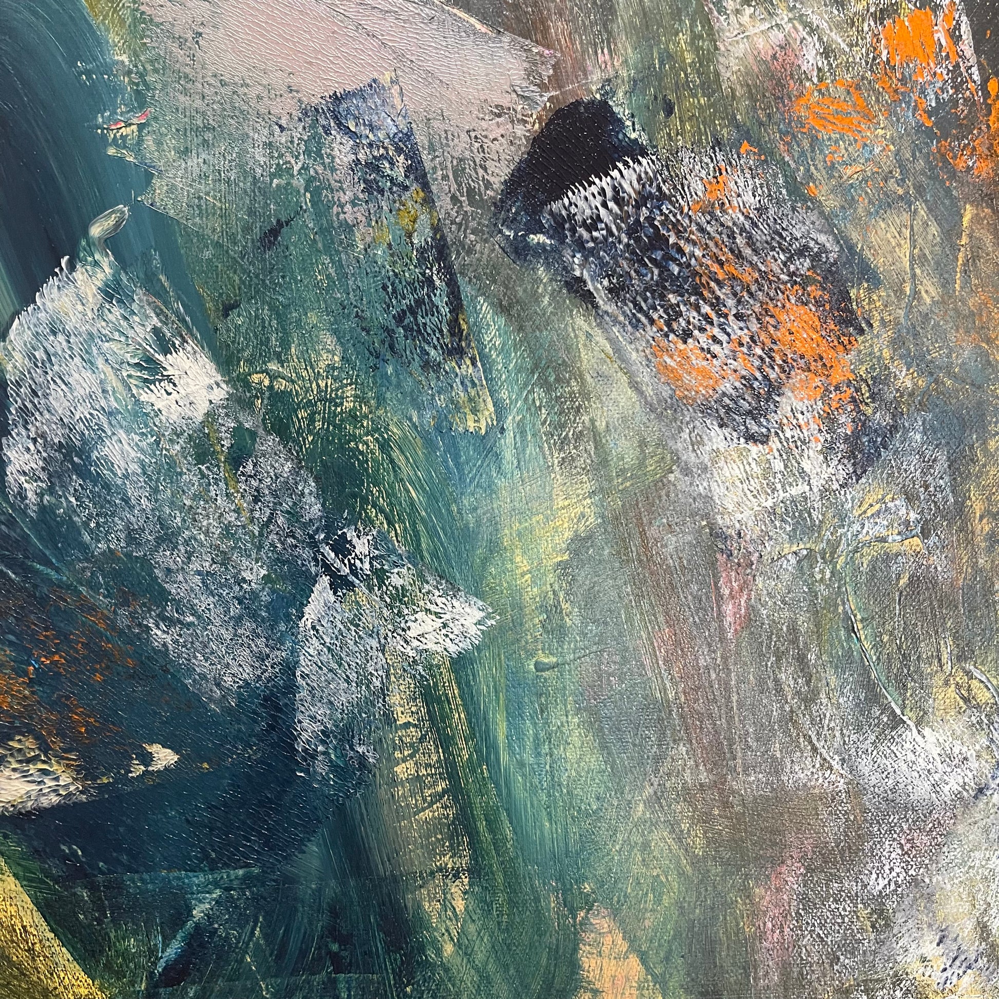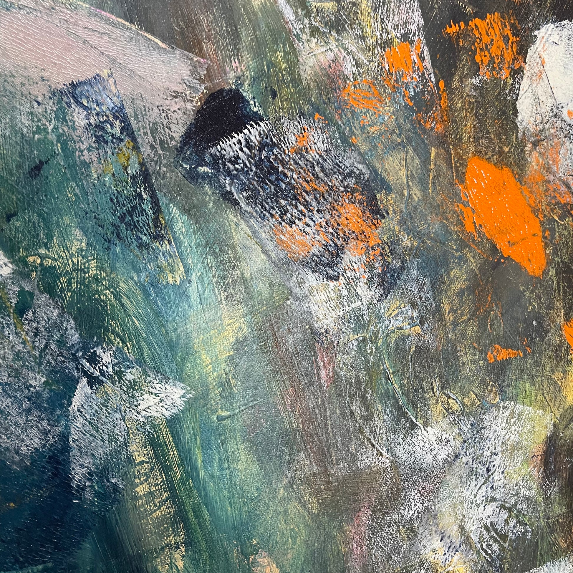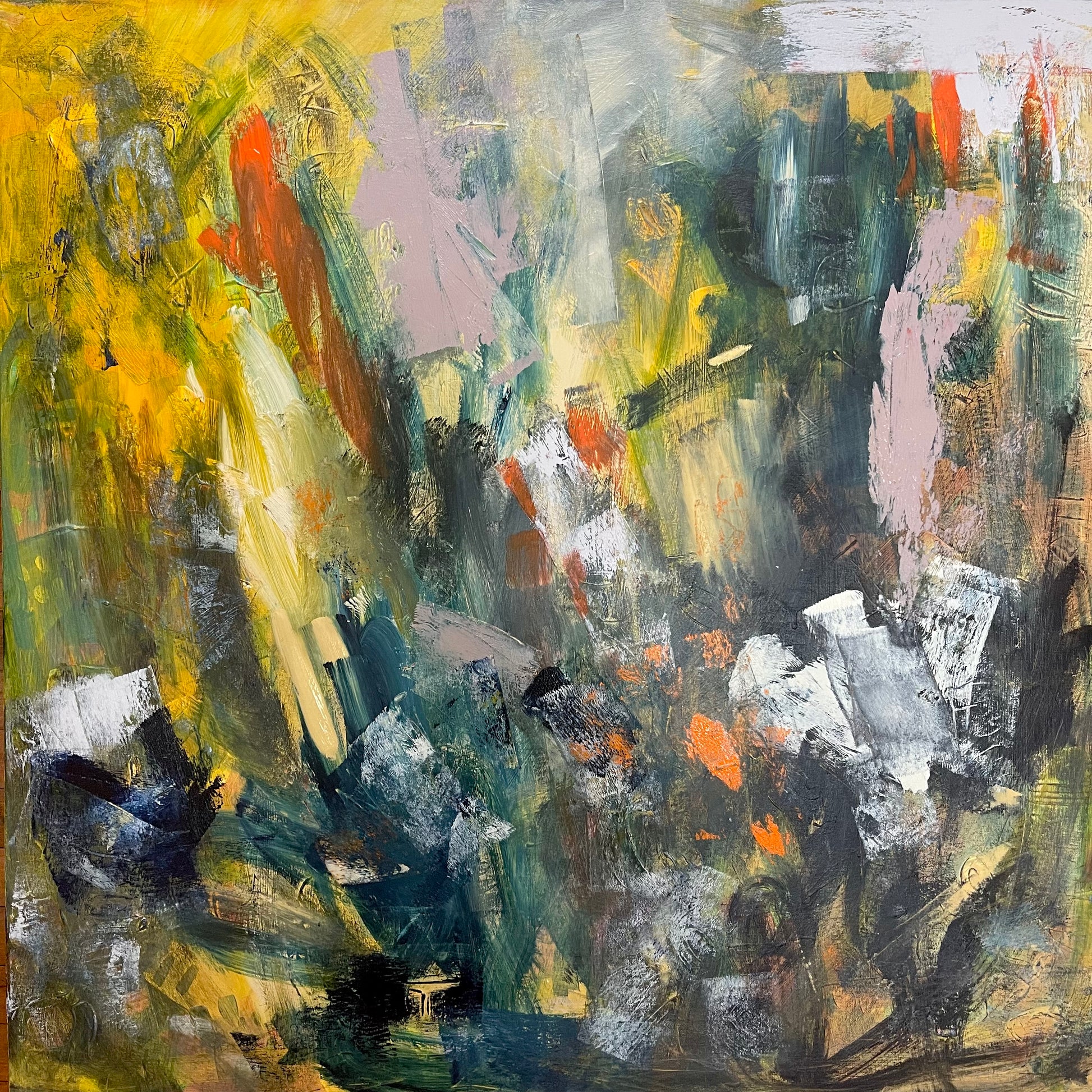 We Keep Rising is an expressive abstract landscape on 36” x 36” stretched canvas.