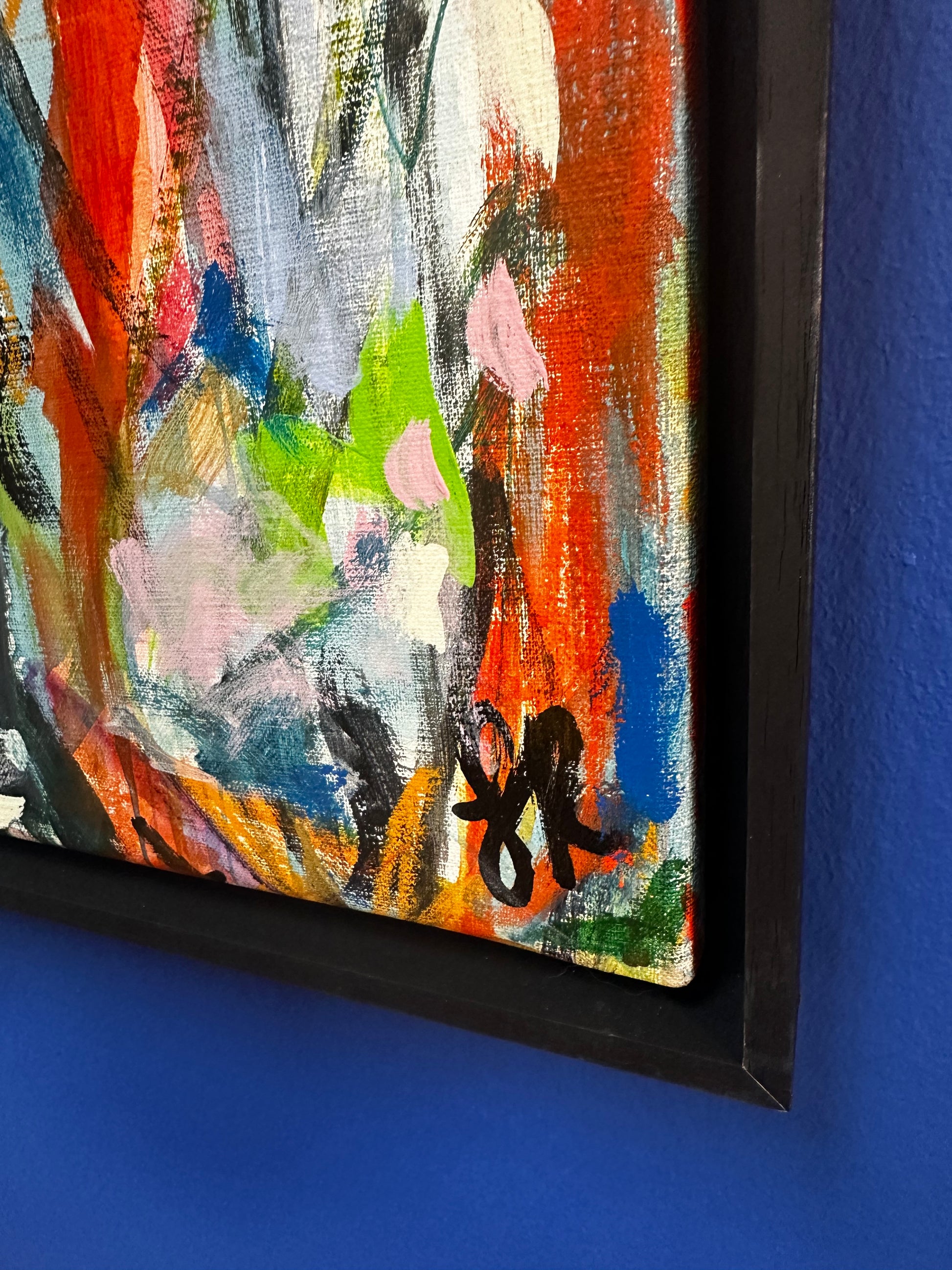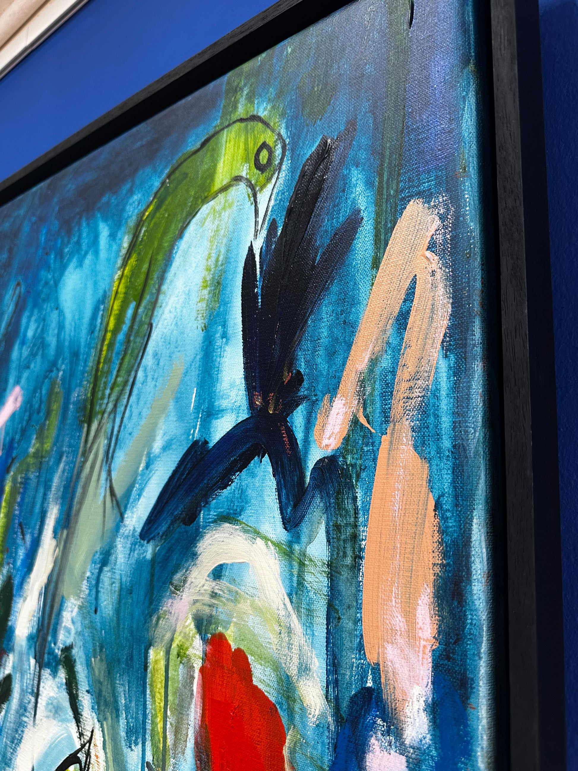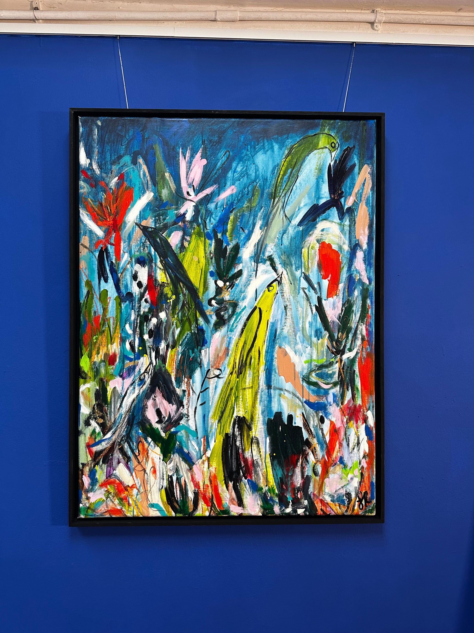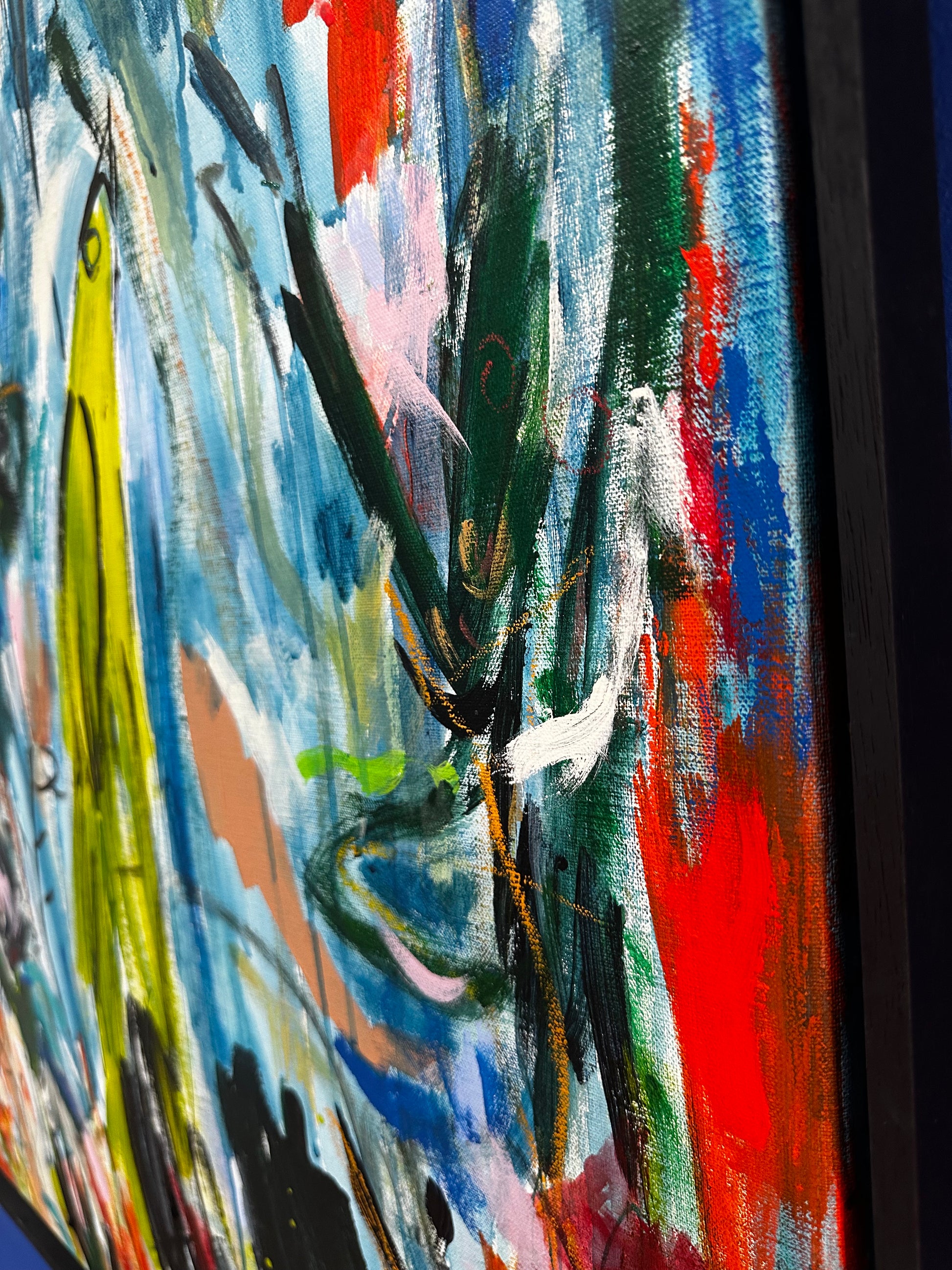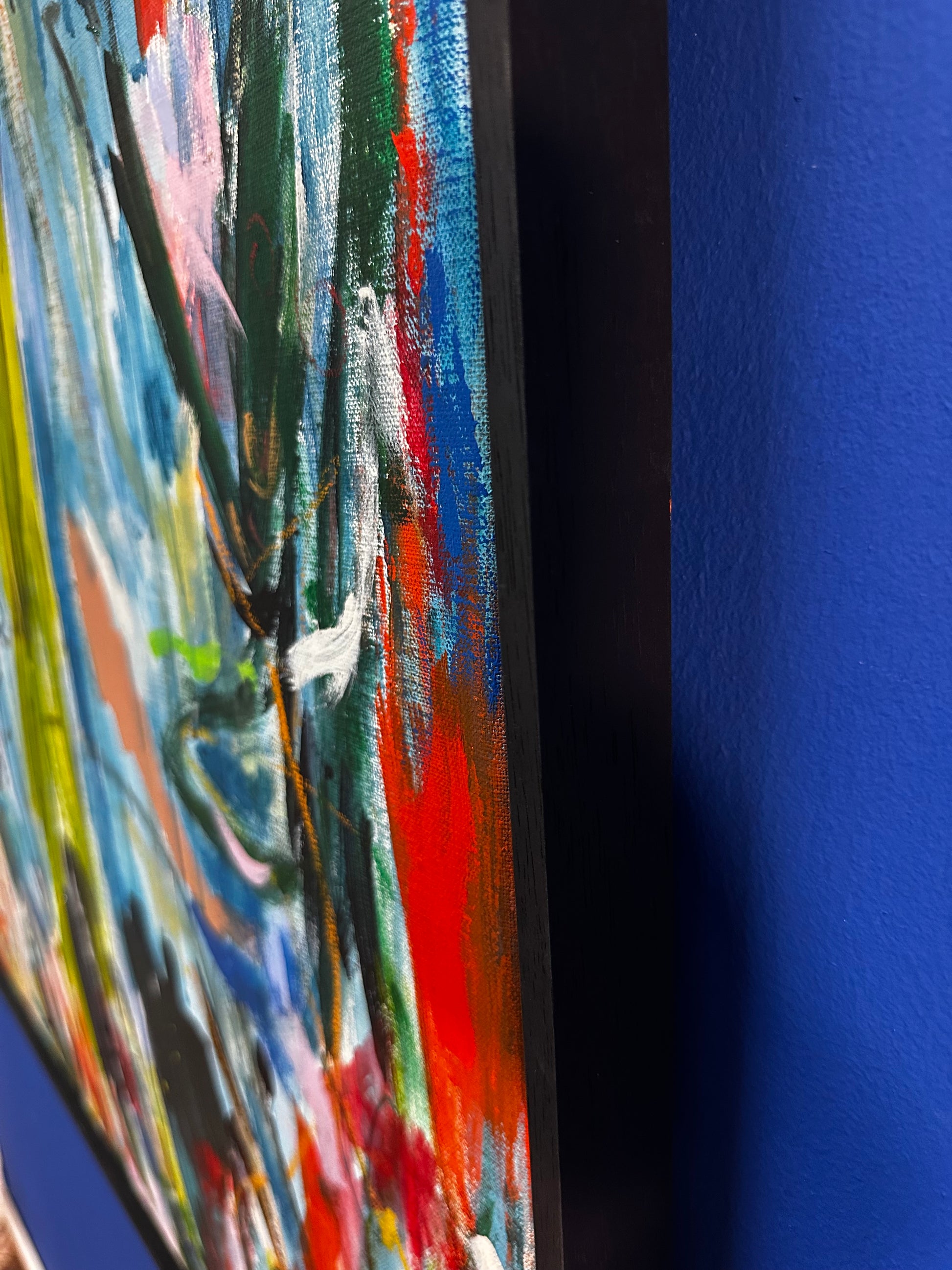 Mixed media on linen- 76cm x 101cm framed in black wood.