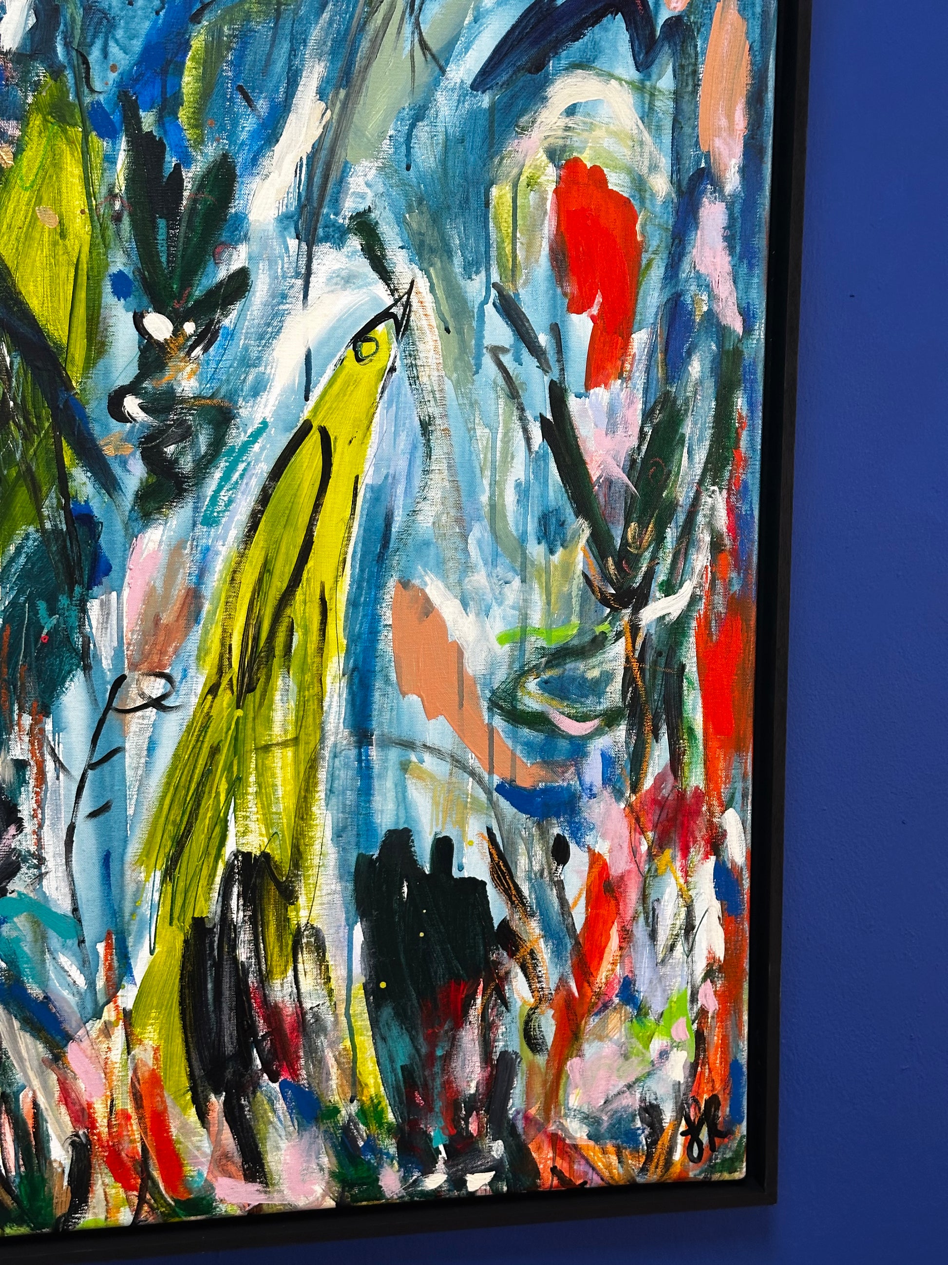 When it rains we’ll Weather It Together. An abstract landscape inspired by the tropical gardens and birds of Singapore.