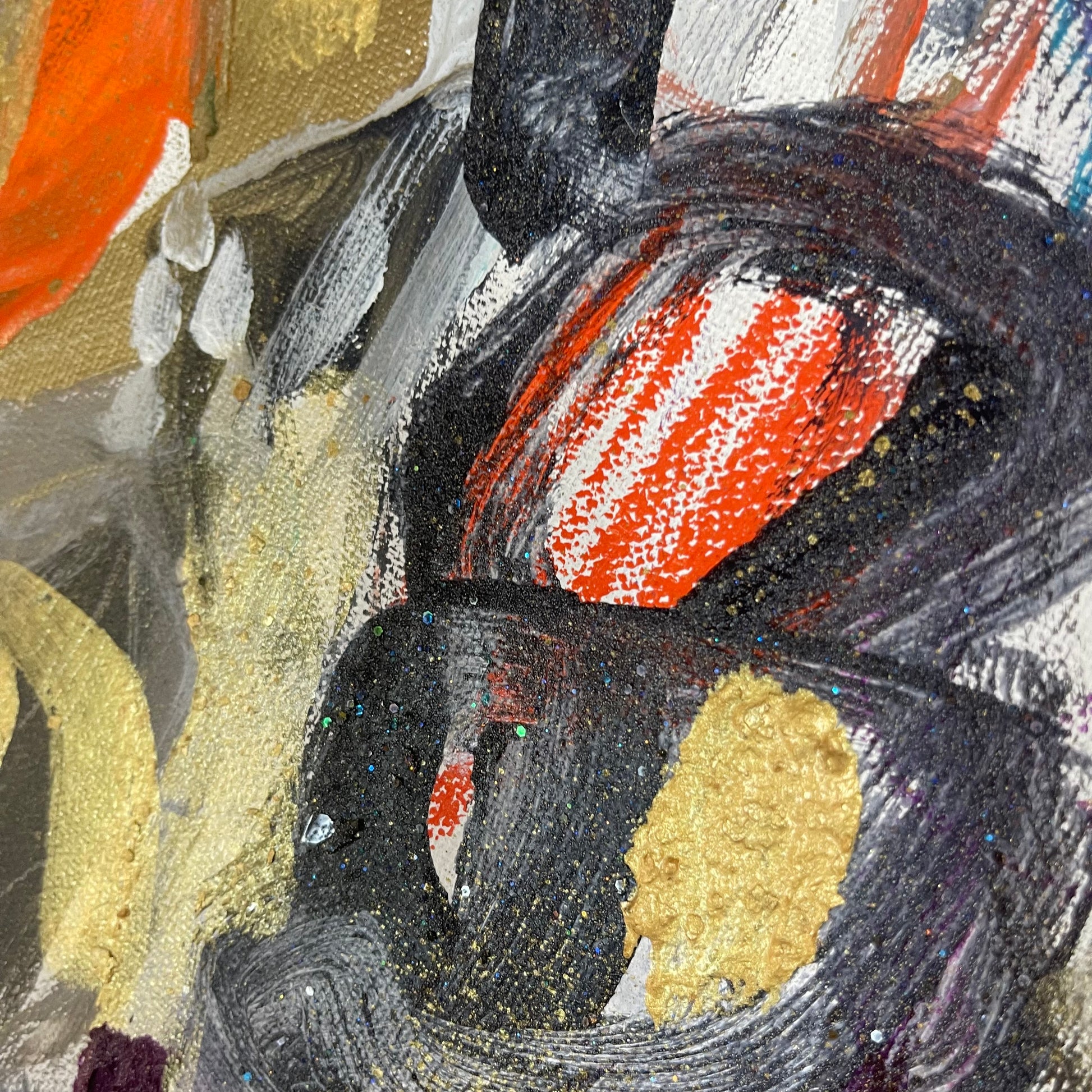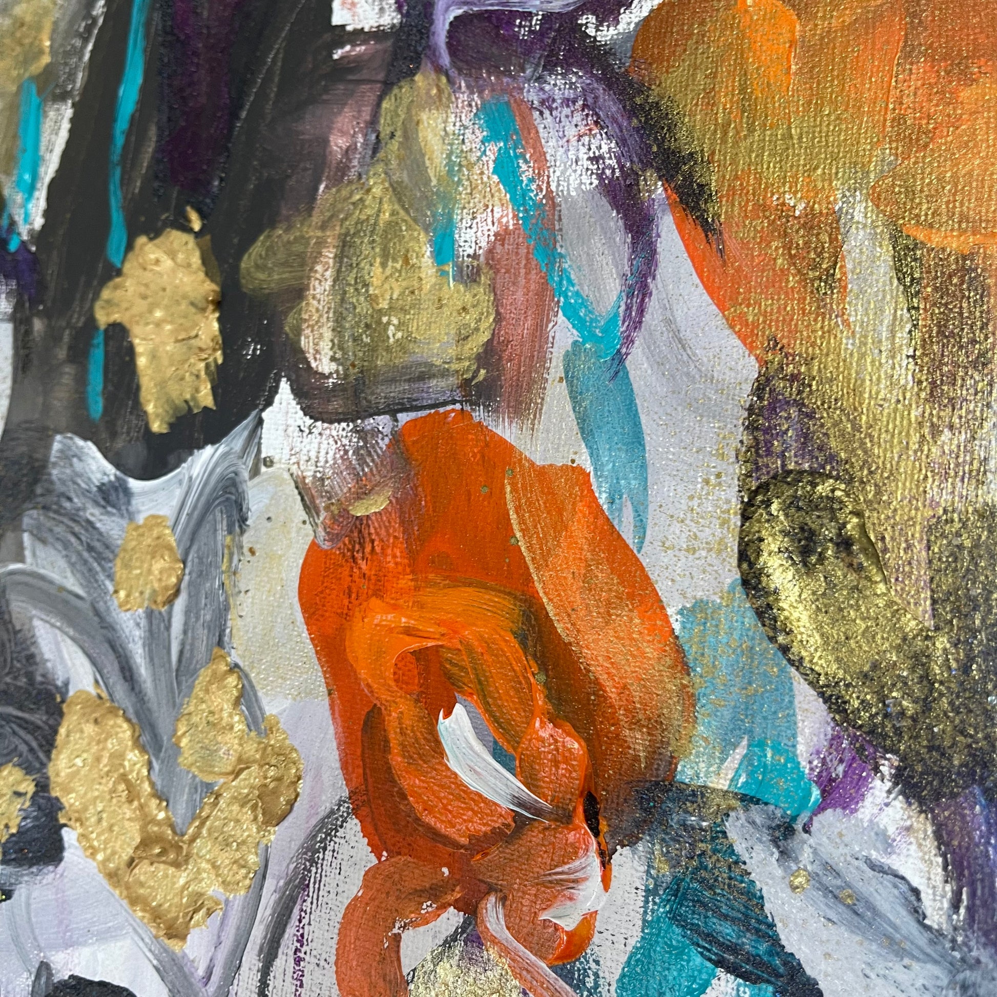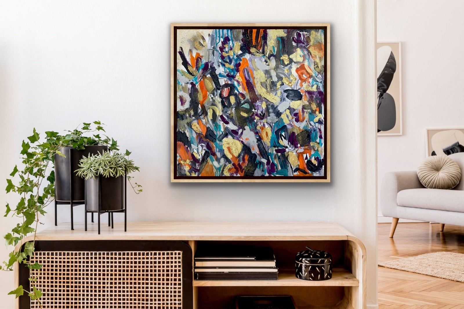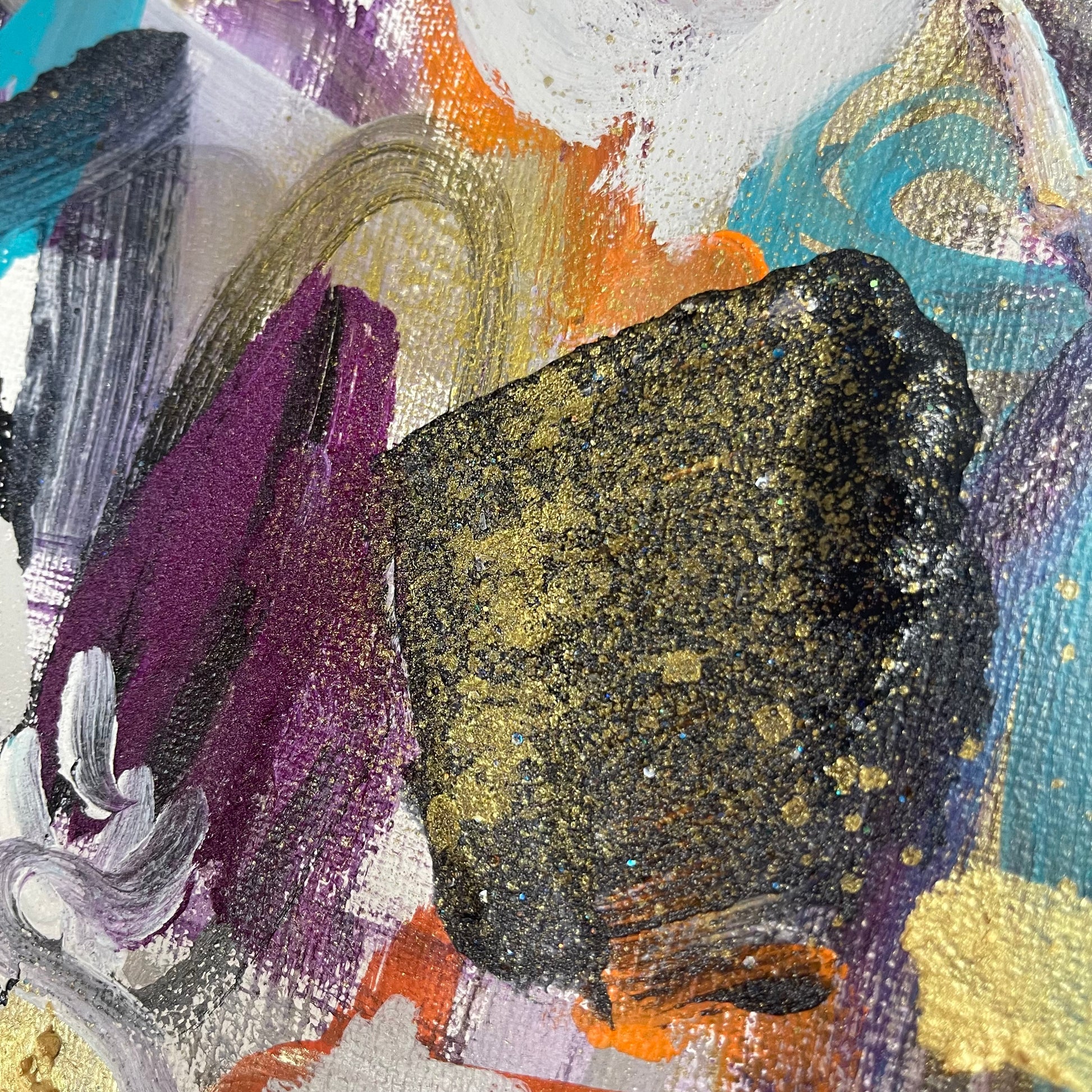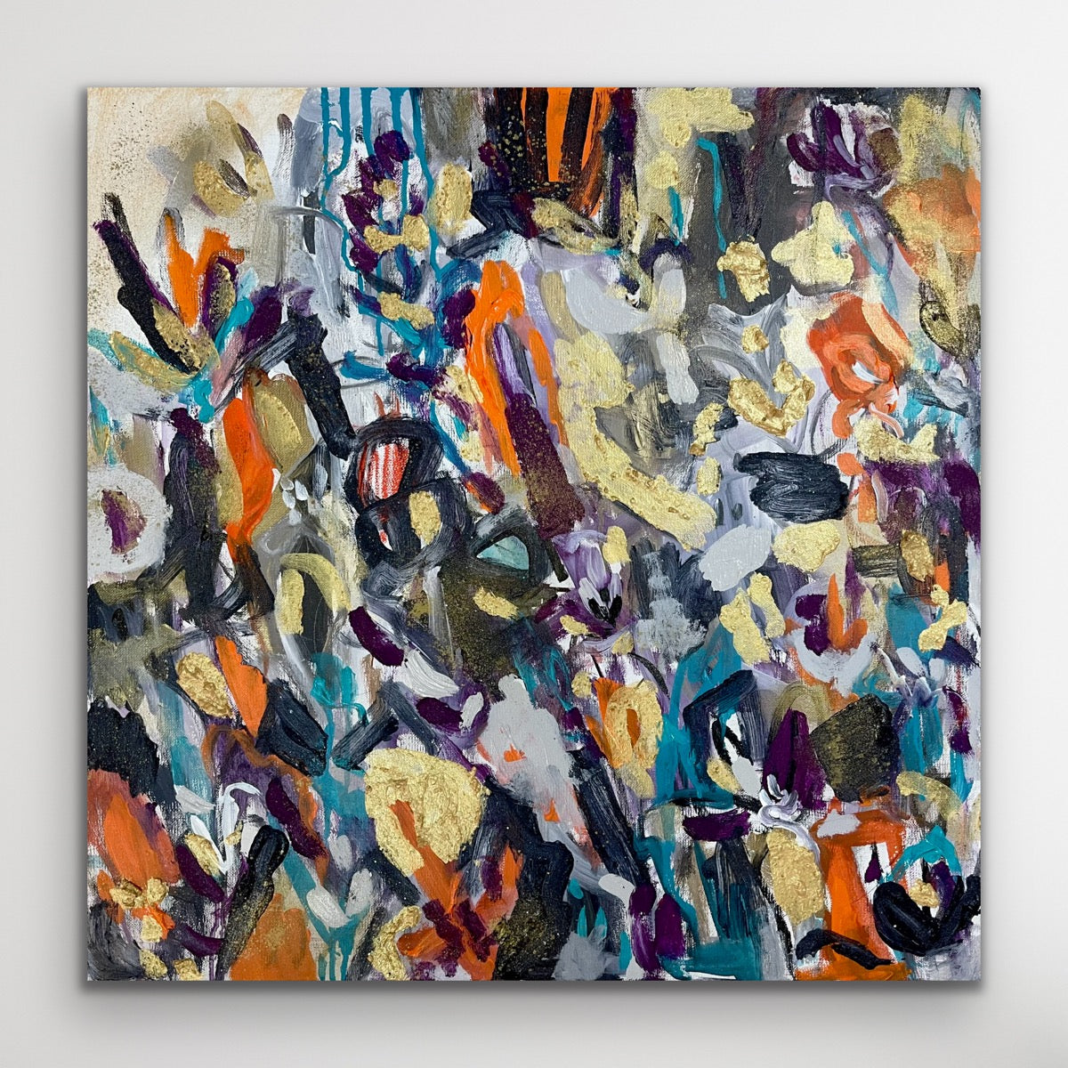 24” x 24” heavily textured abstract landscape on deep, stretched linen canvas. Mixed media includes, acrylic, spray paint, sand, oil pastel and mica.